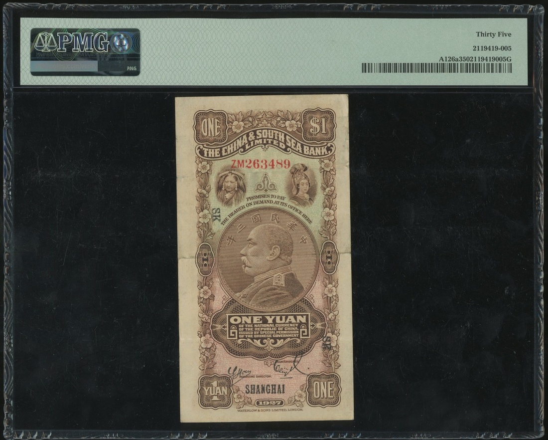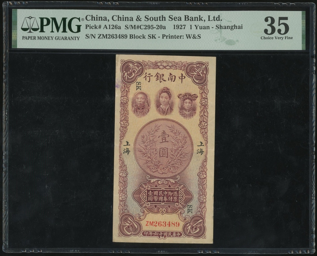 China & South Sea Bank Limited, 1 yuan, Shanghai, Year 16(1927), block SK, serial number ZM263489, (Pick A126a), PMG 35 Choice Very Fine, rare in any grade