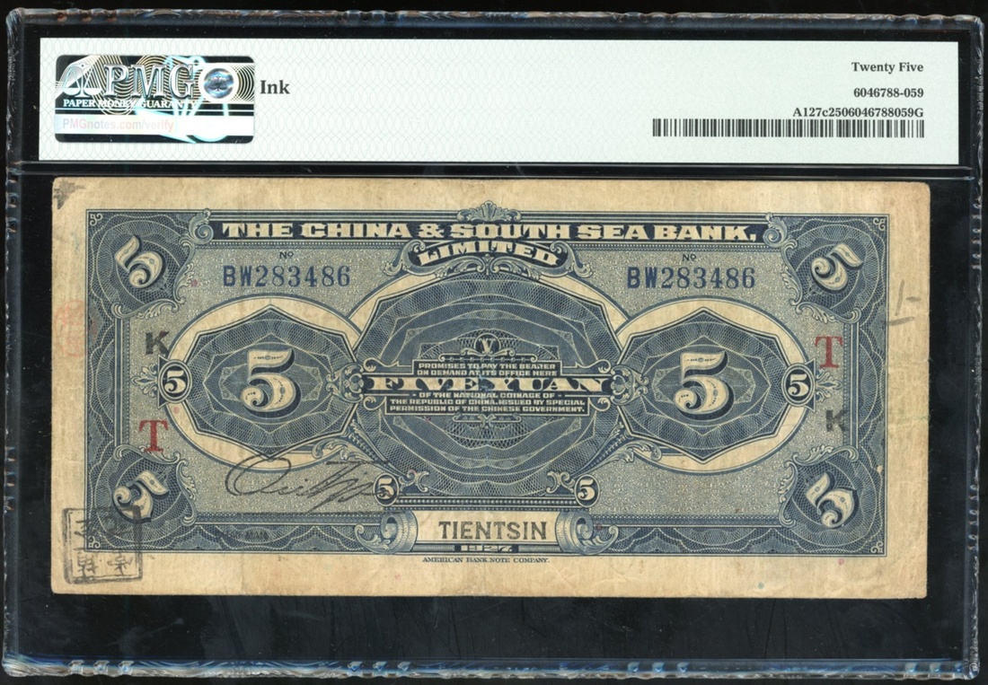China & South Sea Bank, Limited, 5 yuan, Tientsin, Year 16 (1927), serial number BW283486, (Pick A127c), PMG 25 Very Fine (Ink). PMG Census one of two examples, scarce