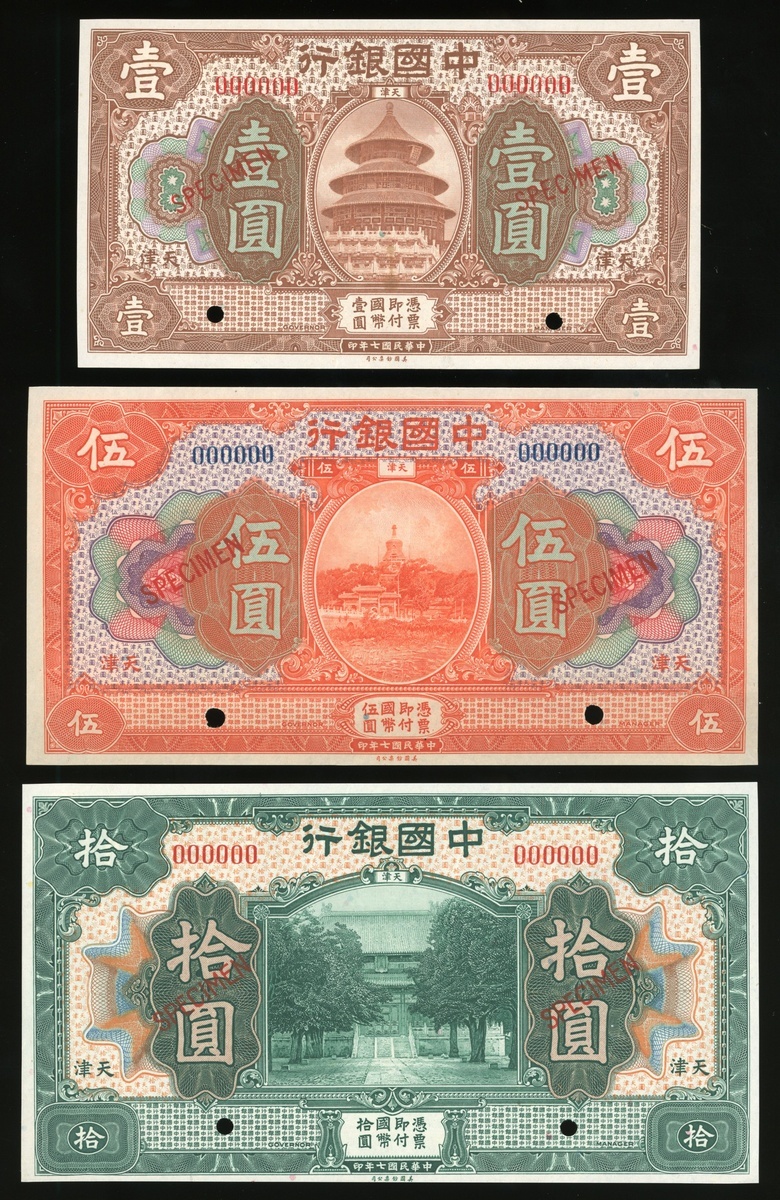 中國銀行樣票一組3枚,壹、伍及拾圓,天津地名,美鈔版,編號000000,均UNC