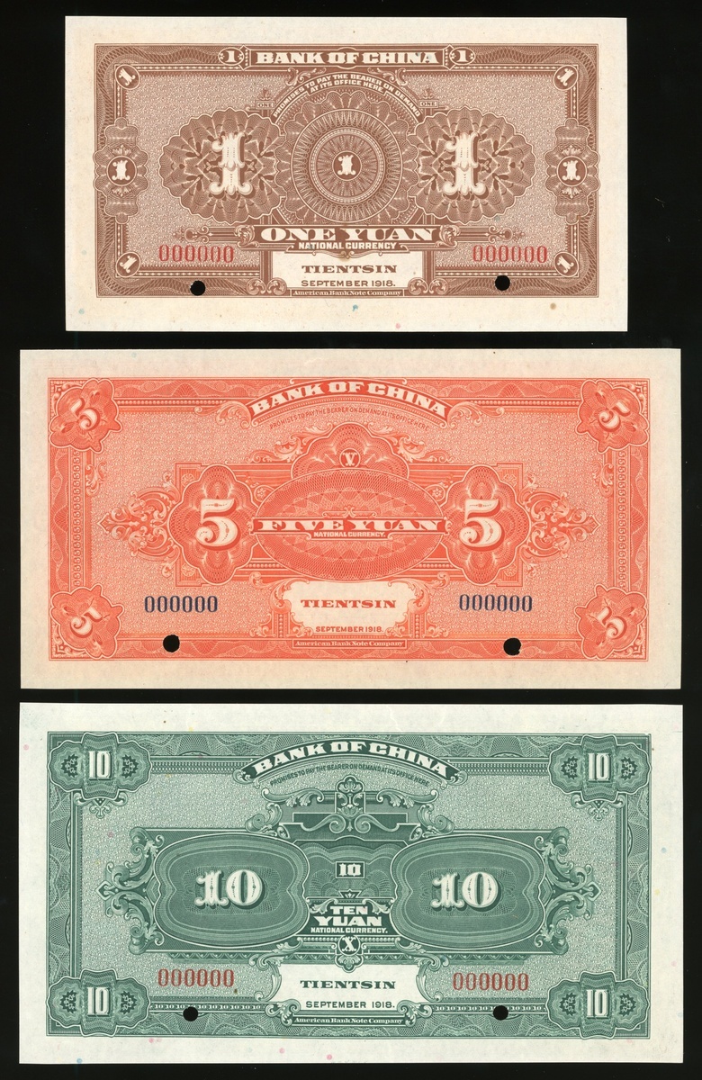 Bank of China, a group of 3x specimen, 1, 5 and 10 yuan, Tientsin, printed by ABNC, serial number 000000 (Pick 51qs, 52ps and 53ps), all uncirculated (3).