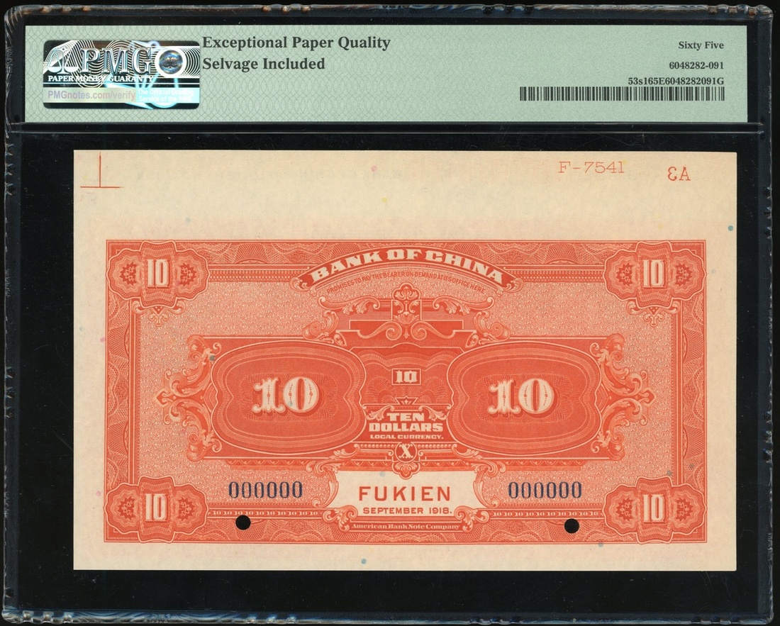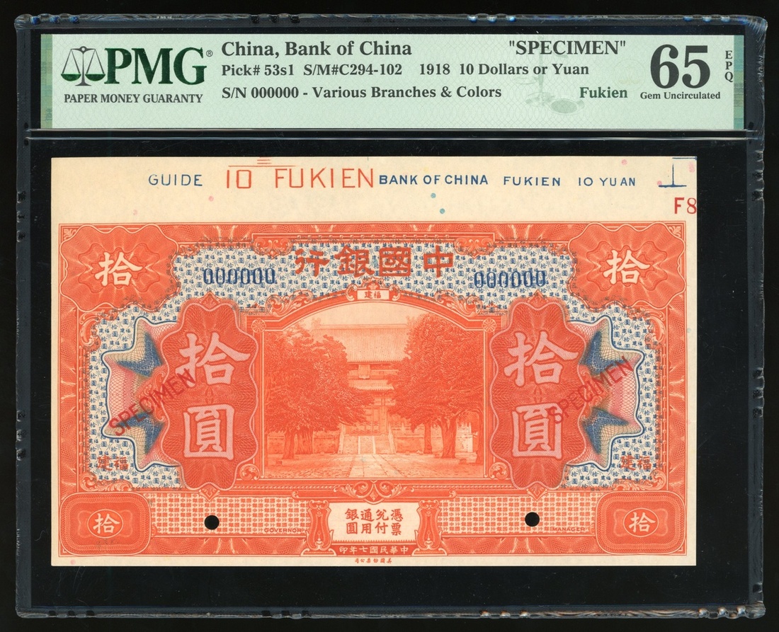 Bank of China, 10 yuan, specimen, Fukien, Year 7 (1918), serial number 000000, printed by ABNC, (Pick 53s1), PMG 65EPQ Gem Uncirculated (Selvage Included).