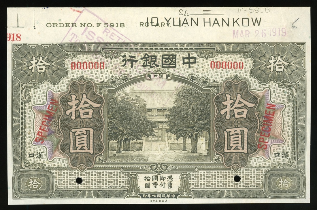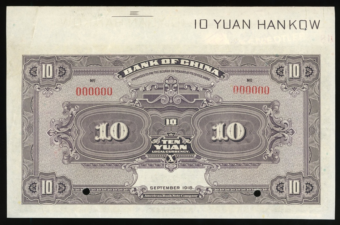民國七年中國銀行拾圓樣票,漢口地名,美鈔版,編號000000,AU品相,有印刷廠蓋章及鉛筆書寫,帶邊紙