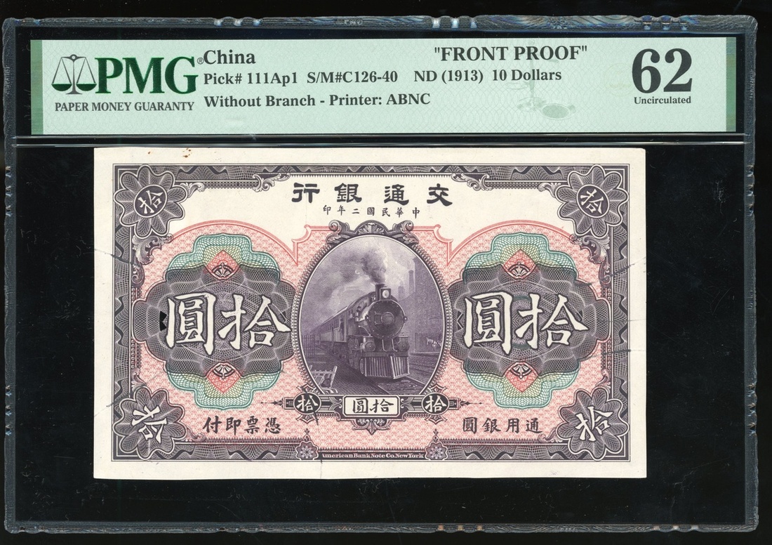Bank of Communications, China, obverse proof 10 dollars yuan, 1913, no serial numbers, uniface, purple, train at centre,