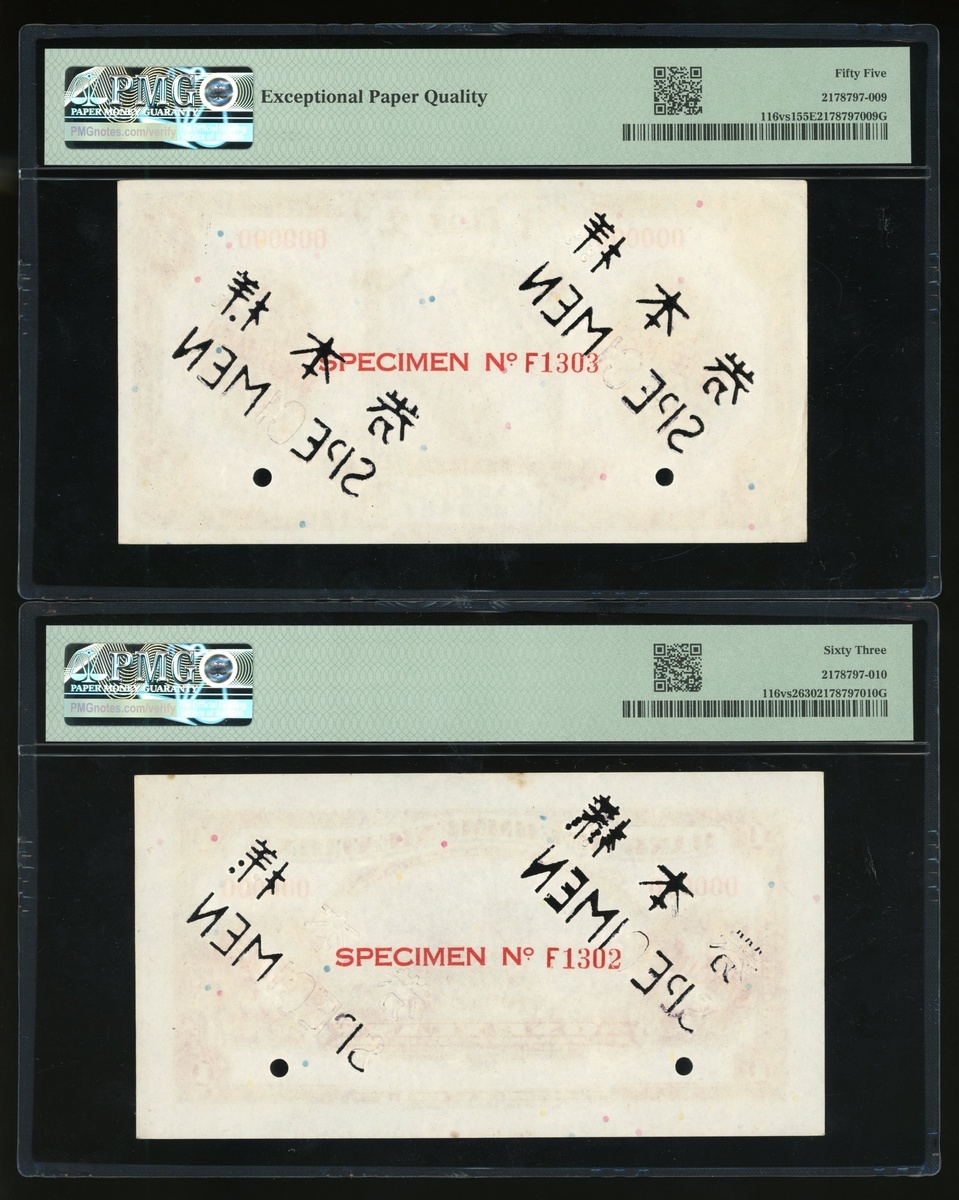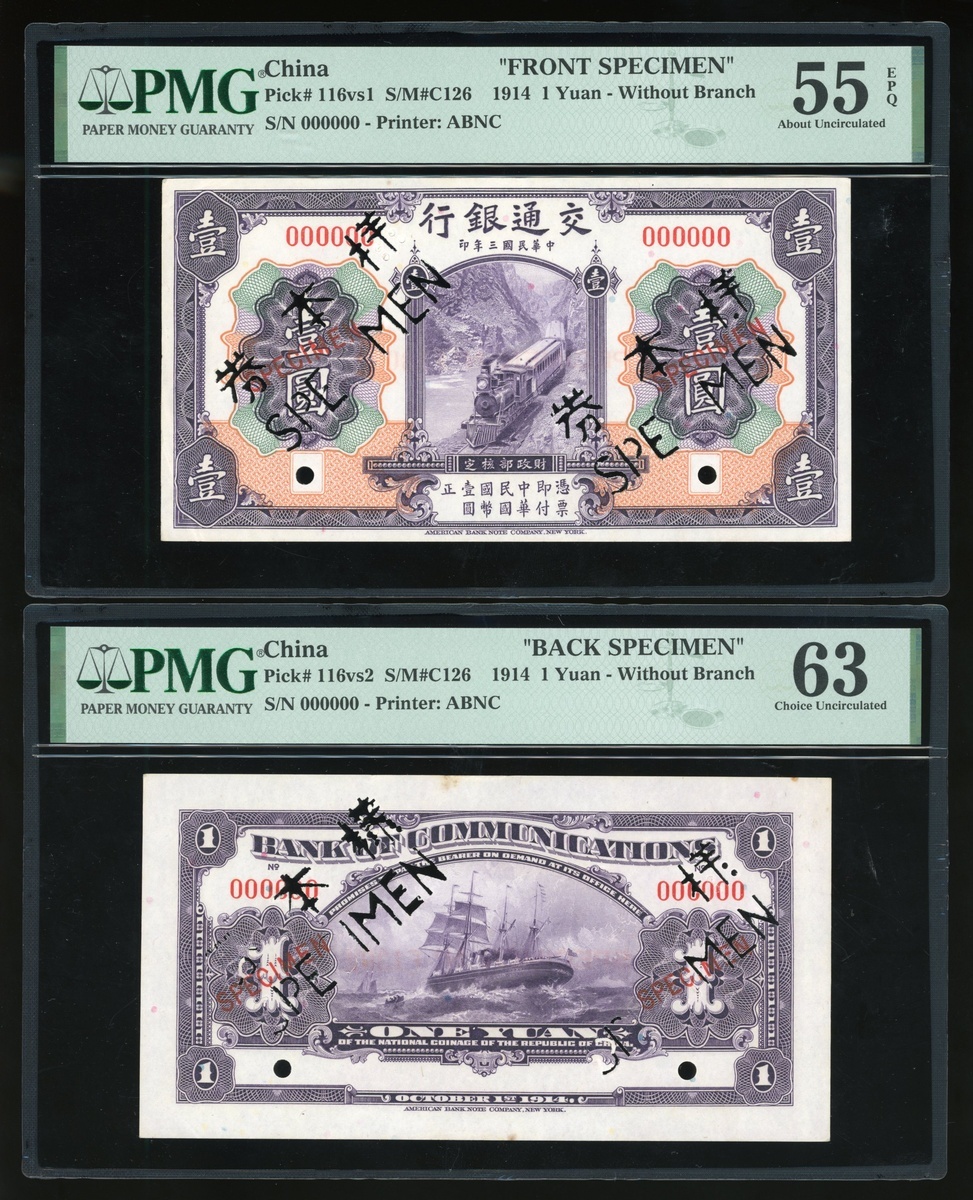 民國三年交通銀行壹圓正反面樣票一對,編號000000,分別評PMG 55EPQ及63,少見