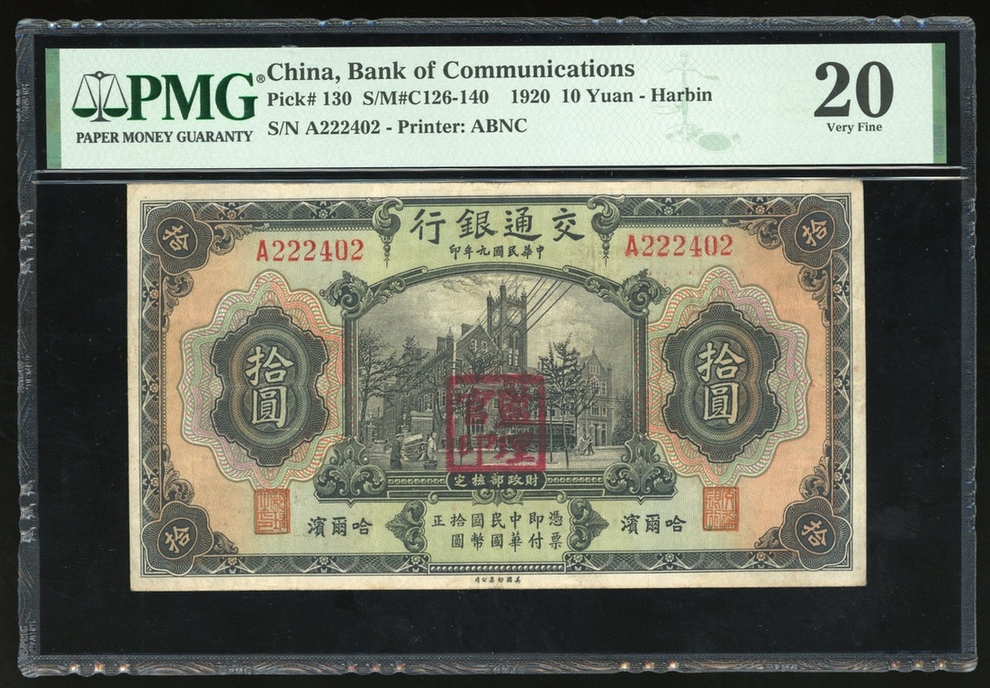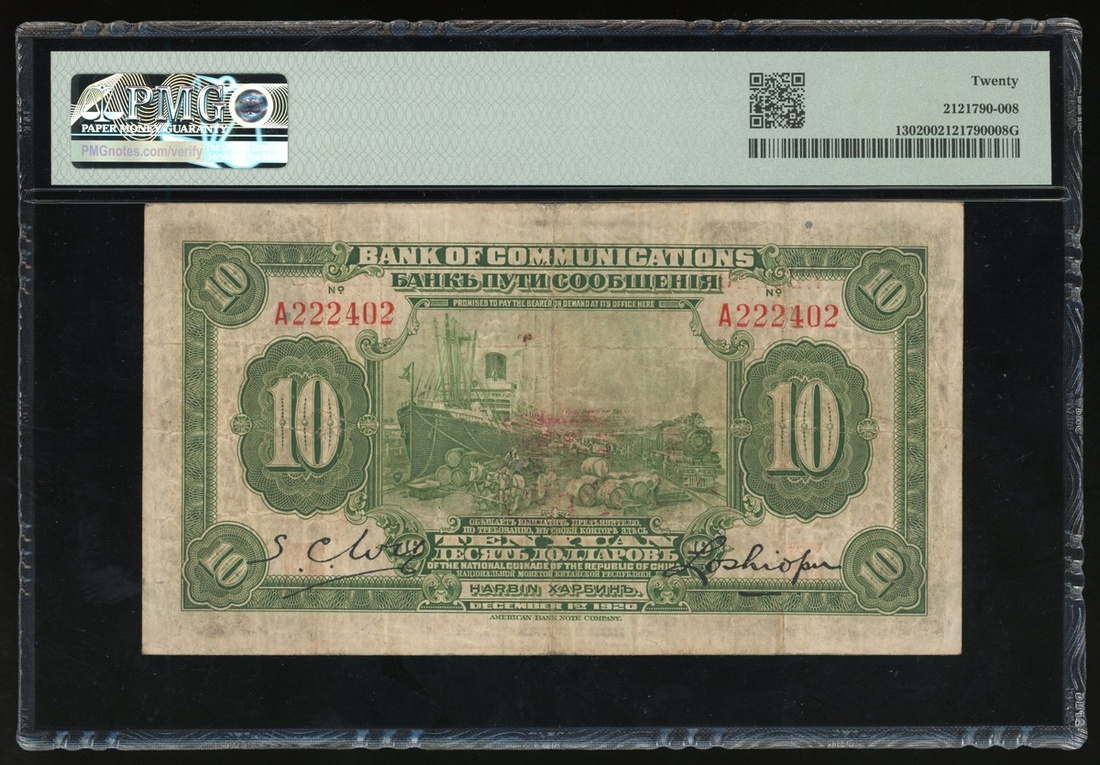 民國九年交通銀行拾圓,哈爾濱地名,編號A222402,中央有紅印「監理官印」,PMG 20,記錄中最高分,本鈔相信是為哈爾濱使用而加蓋,背有西里爾文,中央紅印出自日本政府,應為1931年入侵東三省後所加,本系列之伍拾及壹百圓僅見樣票,故拾圓是流通票中最大之面值,數年前曾見加蓋樣票的例子,如此的流通票相信存世極稀,不容錯失