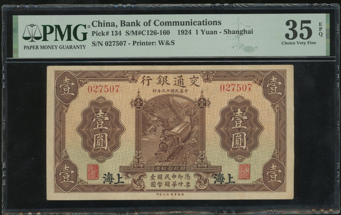 Bank of Communciations, China, 1 yuan, Shanghai, Year 13(1924), serial number 027507, (Pick 134), PMG 35EPQ Choice Very Fine, the single highest grade in PMG population report, most of the Chinese banknotes printed by Waterlow & Son was recalled due to the poor paper quality. An excellent example for type