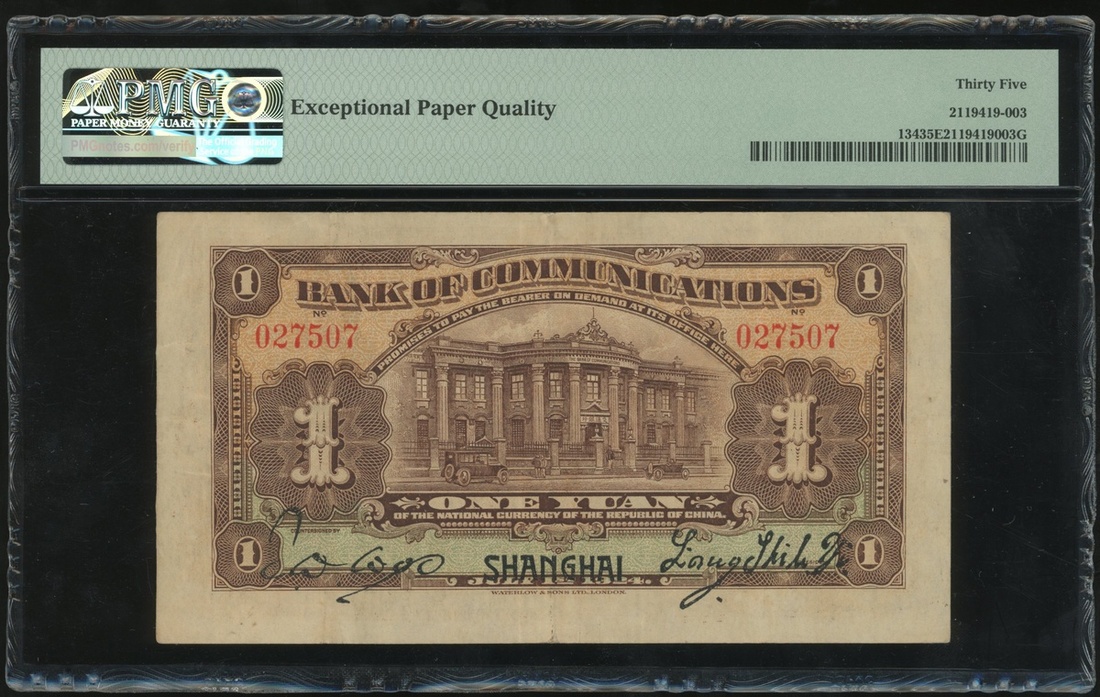 民國十三年交通銀行壹圓,上海地名,編號027507,PMG 35EPQ,PMG記錄中唯一最高分,華德路印刷之鈔票大多都因紙質差劣而回收,故甚為罕有