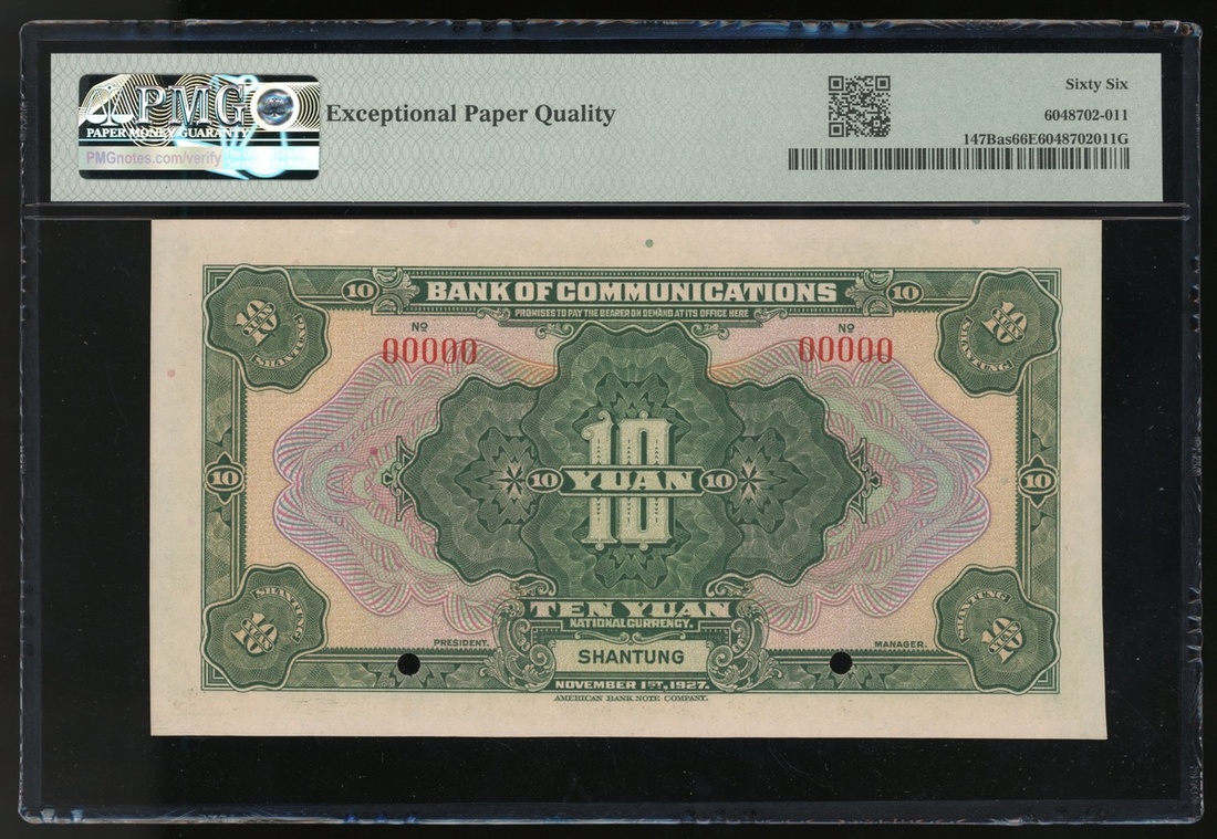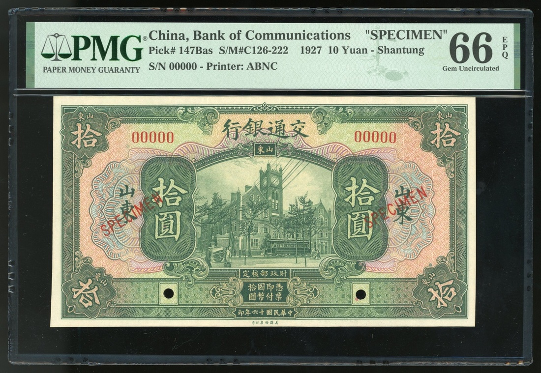 民國十六年交通銀行拾圓樣票,山東地名,編號00000,PMG 66EPQ