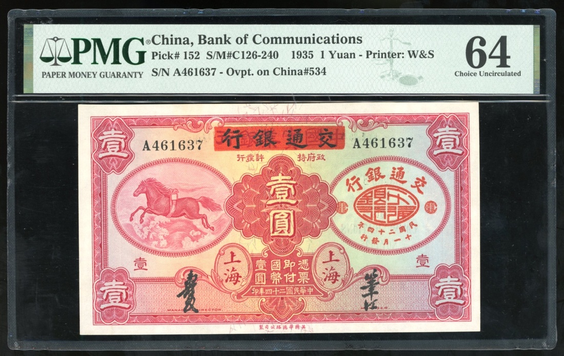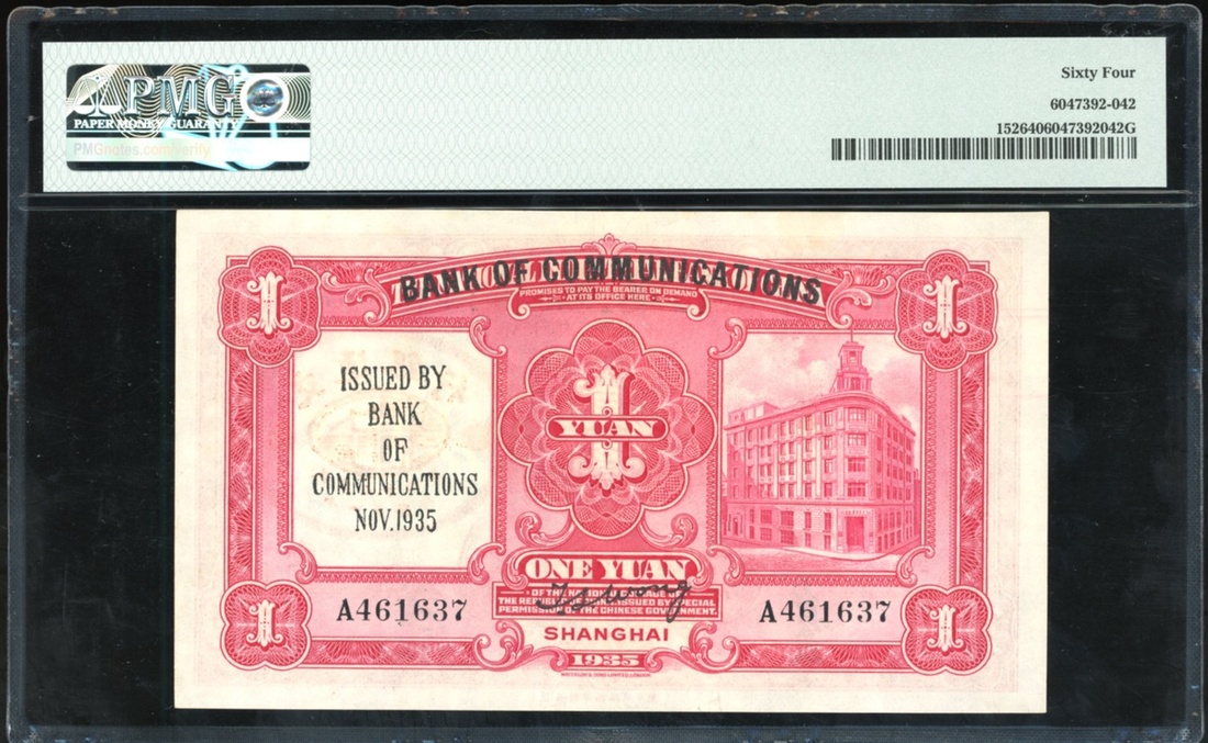 民國二十四年中國實業銀行改交通銀行壹圓,編號A461637,PMG 64,罕見加蓋版別