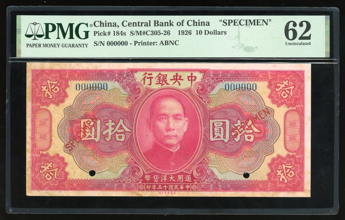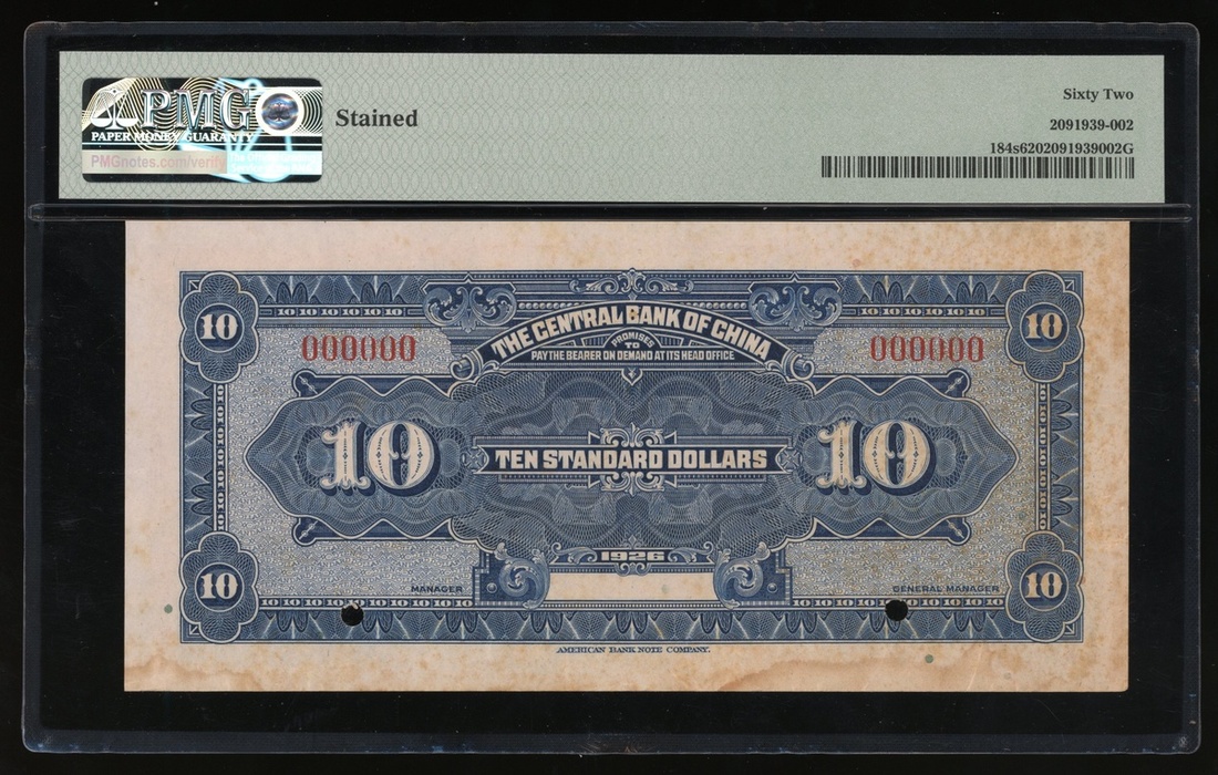 民國十五年中央銀行拾圓樣票,編號000000,PMG 62,有漬