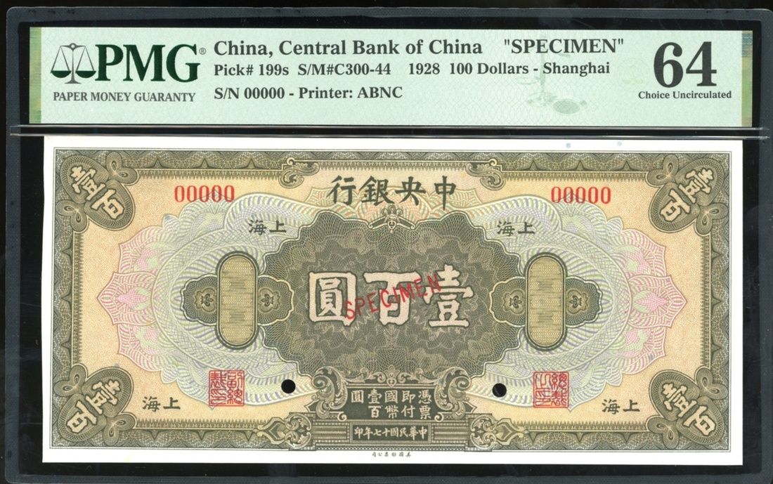 The Central Bank of China, 100 dollars, 1928, Shanghai, specimen, serial number 00000, (Pick 199s), PMG 64 Choice Uncirculated. The ONLY note in the PMG population report!