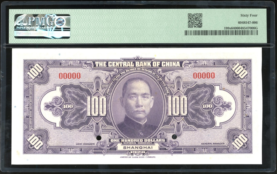 民國二十七年中央銀行壹百圓樣票,上海地名,編號000000,PMG 64,PMG記錄中唯一的一枚!
