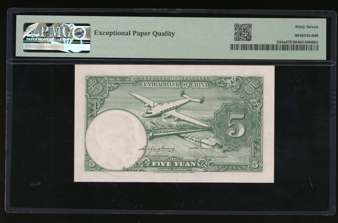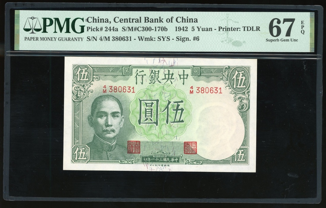 The Central Bank of China, 5 yuan, 1942, serial number 4/M 380631, (Pick 244a), PMG 67EPQ Superb Gem Uncirculated. The HIGHEST grade in the PMG population report!