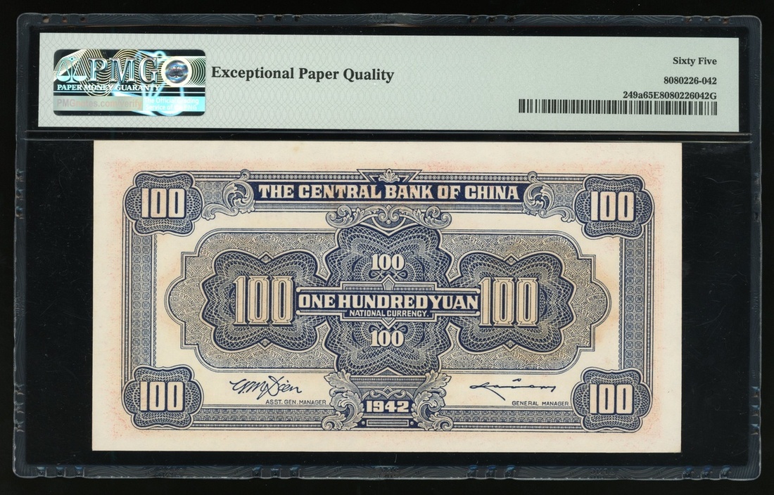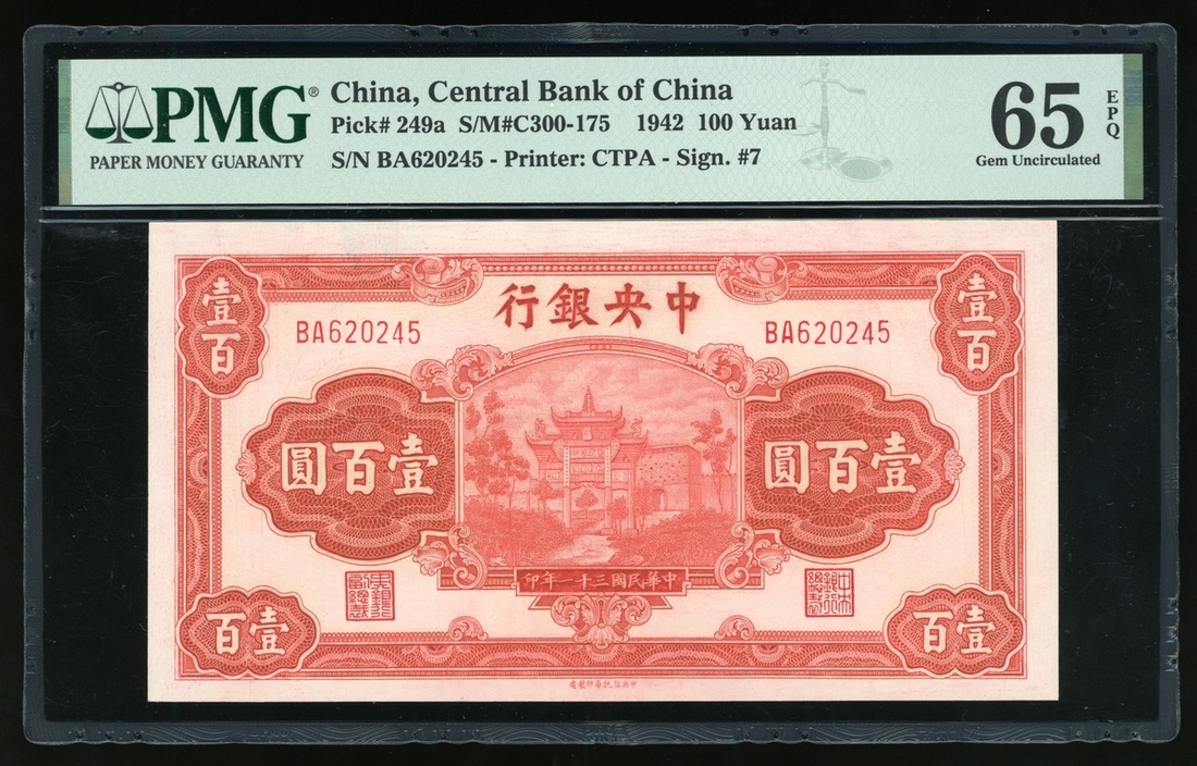 Central Bank of China, 100 yuan, 1942, serial number BA620245, (Pick 249a), PMG 65EPQ.