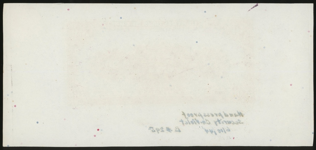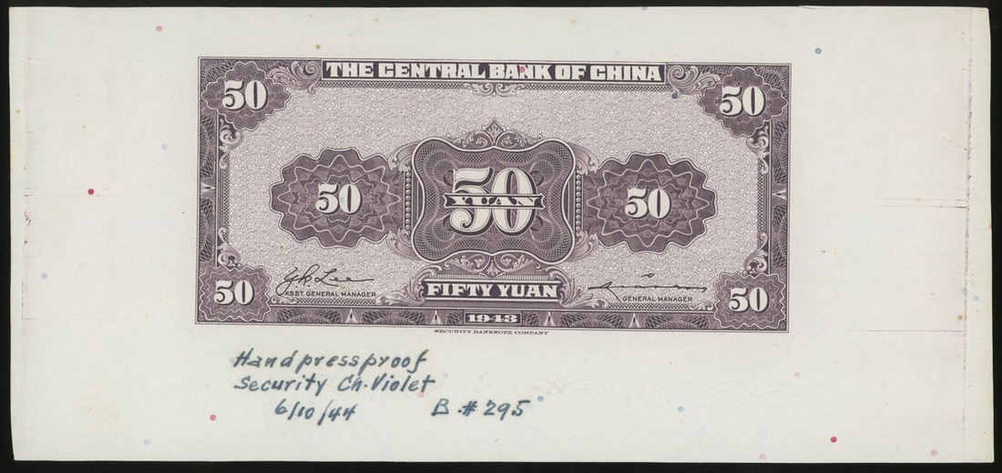 民國三十二年中央銀行伍拾圓背面試印樣鈔,為未經採納之設計,有印刷廠筆注 'Hand press proof Security Ch. Violet 6/10/44',本品應為1945-47年由美商保安鈔票公司印刷之系列,最大面值為貳百圓,相信此為孤品
