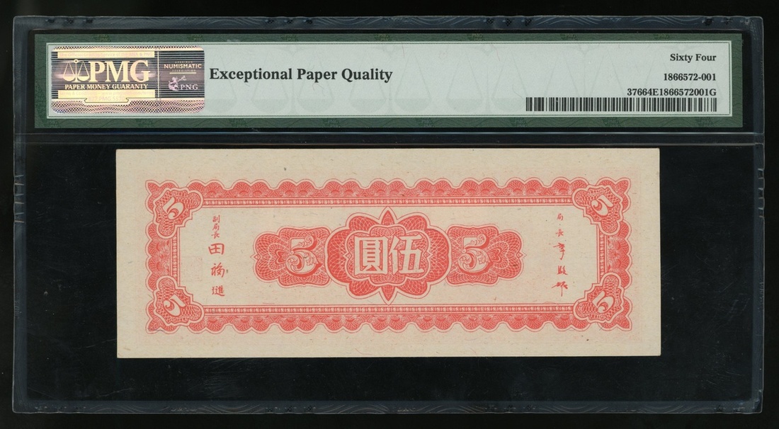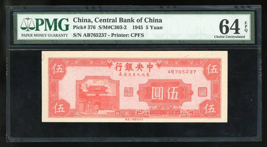 民國三十四年中央銀行東北九省流通券伍圓,編號AB765237,PMG 64EPQ