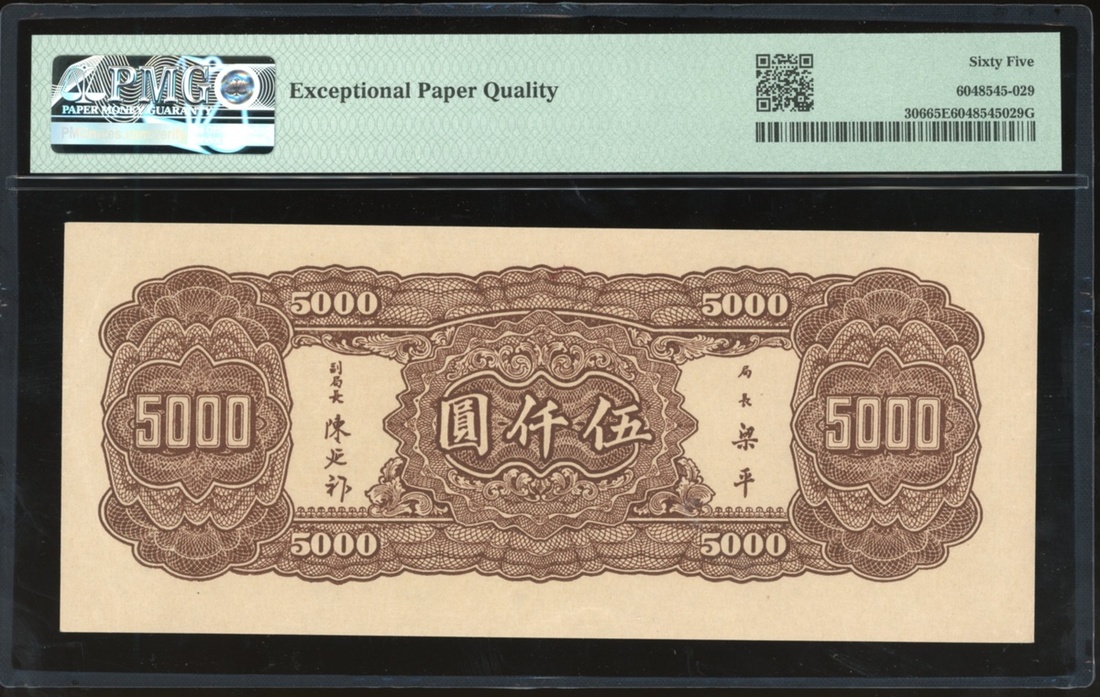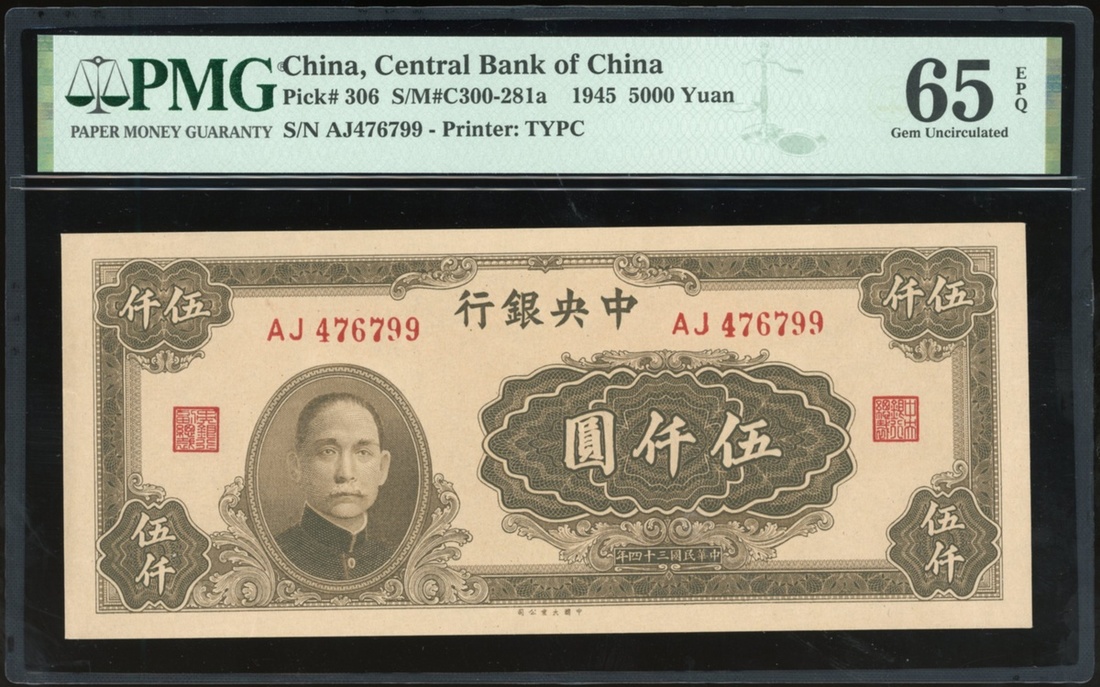 The Central Bank of China, 5000 yuan, Year 34 (1945), serial number AJ476799, (Pick 306), PMG 65EPQ Gem Uncirculated
