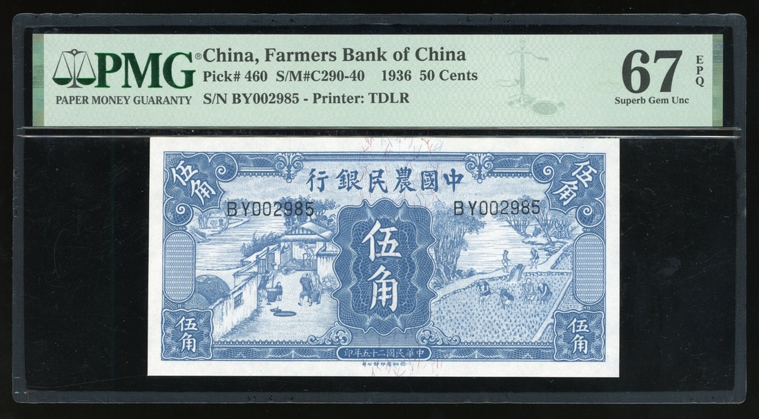 Farmers Bank of China, 50 cents, 1936, low serial number BY002985, (Pick 460), PMG 67EPQ, the highest grade by far, only 14 notes at this grade, rare and sought after.