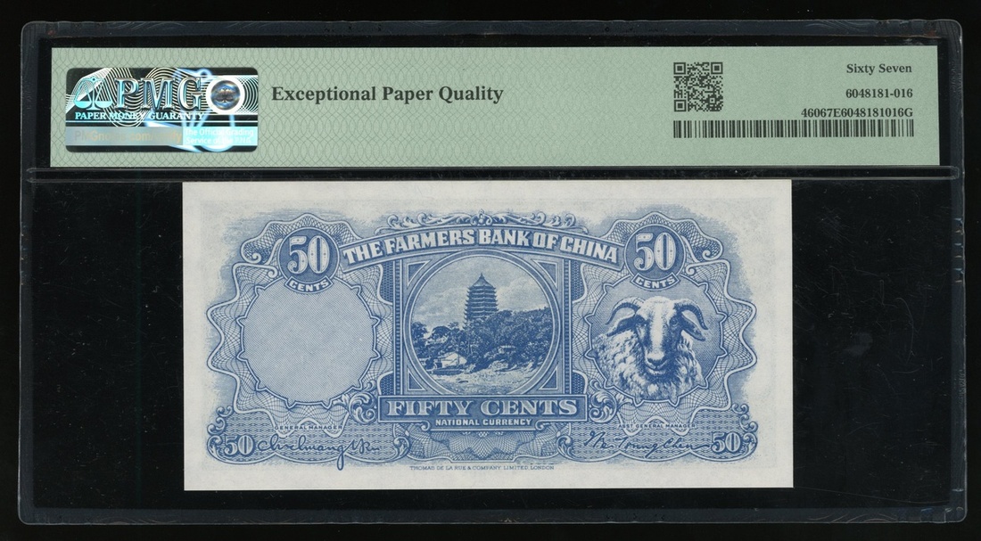 民國二十五年中國農民銀行伍角,編號BY002985,PMG 67EPQ,為目前為止最高評分,同分有14枚,罕見之大熱版別