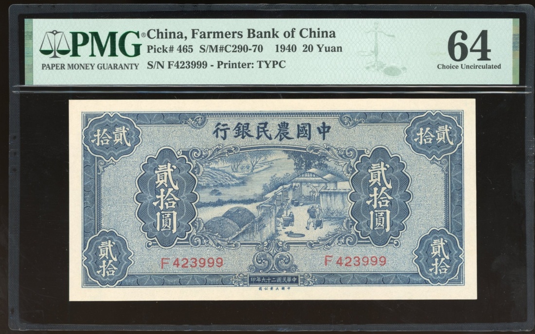 The Farmers Bank of China, 20 yuan, Year 29 (1940), serial number F423999, (Pick 465), PMG 64 Choice Uncirculated