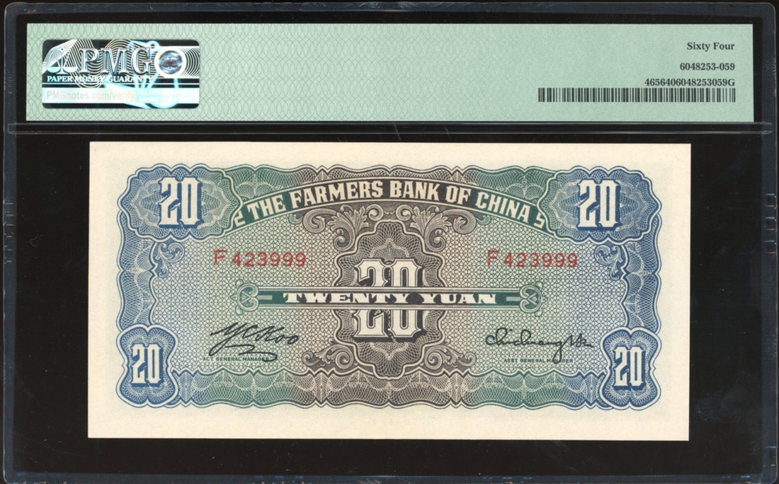 民國二十九年中國農民銀行貳拾圓,編號F423999,PMG 64