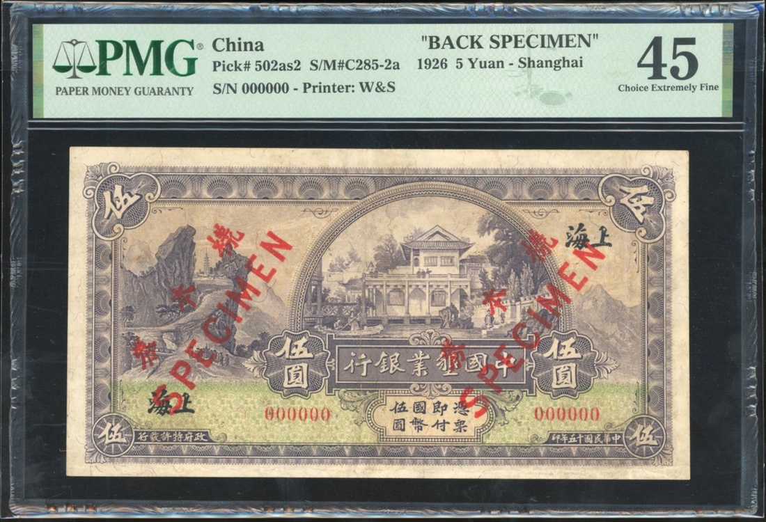 Land Bank of China, Limited, obverse specimen 5 yuan, 1926, Shanghai, serial number 000000, (Pick 502as2), PMG 45 Choice Extremely Fine. A gorgeous Waterlow and Sons specimen, only a handful of examples known.