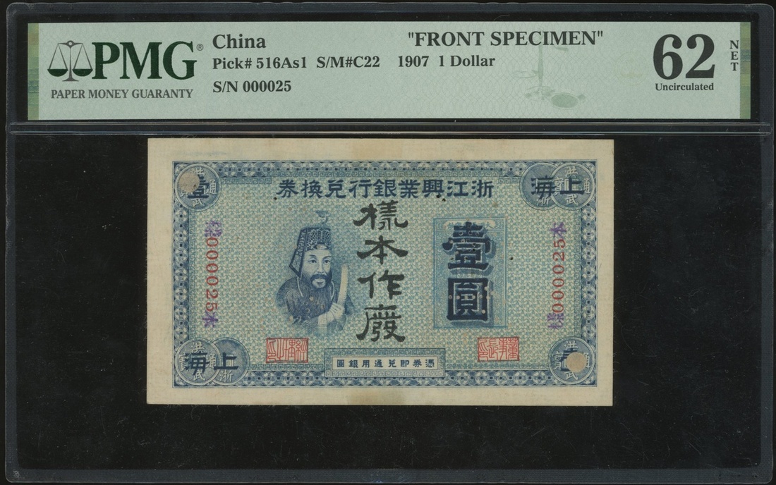 1907年浙江興業銀行兌換券壹圓正面樣票,上海地名,編號000025,PMG 62NET,有黏貼痕跡,PMG記錄唯一最高分,罕見版別