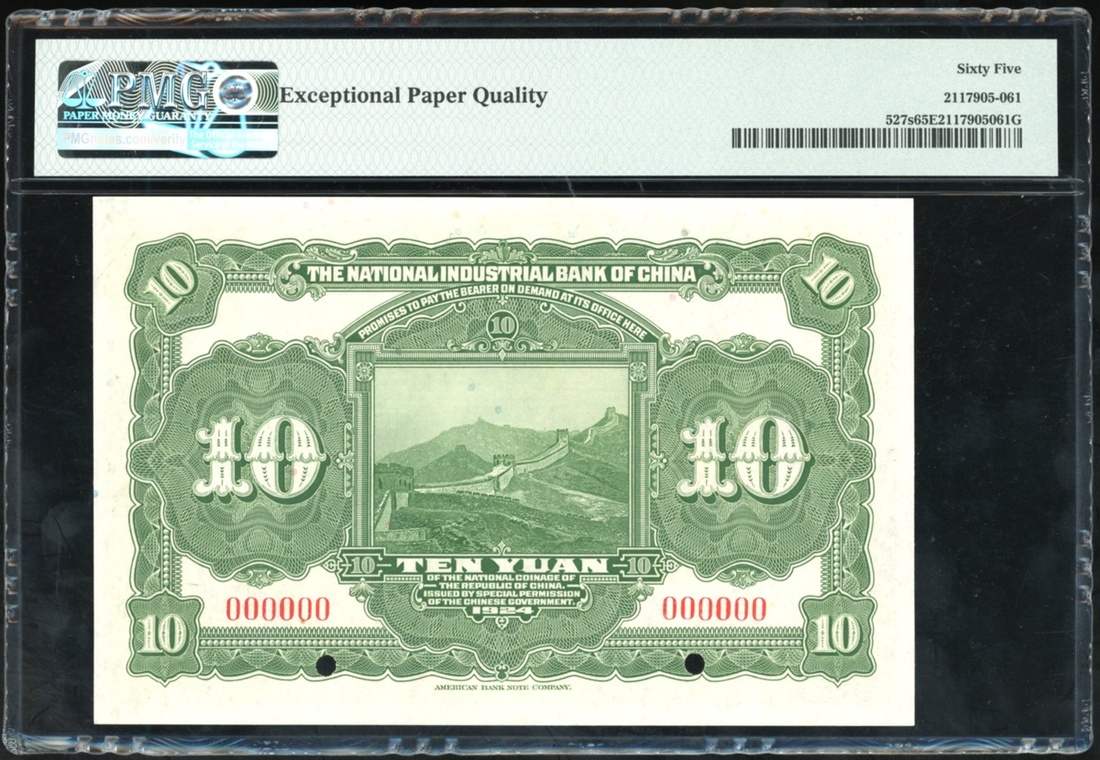 National Industrial Bank, China, 10 yuan, specimen, Year 13(1924), serial number 000000, (Pick 527s), PMG 65EPQ Gem Uncirculated.