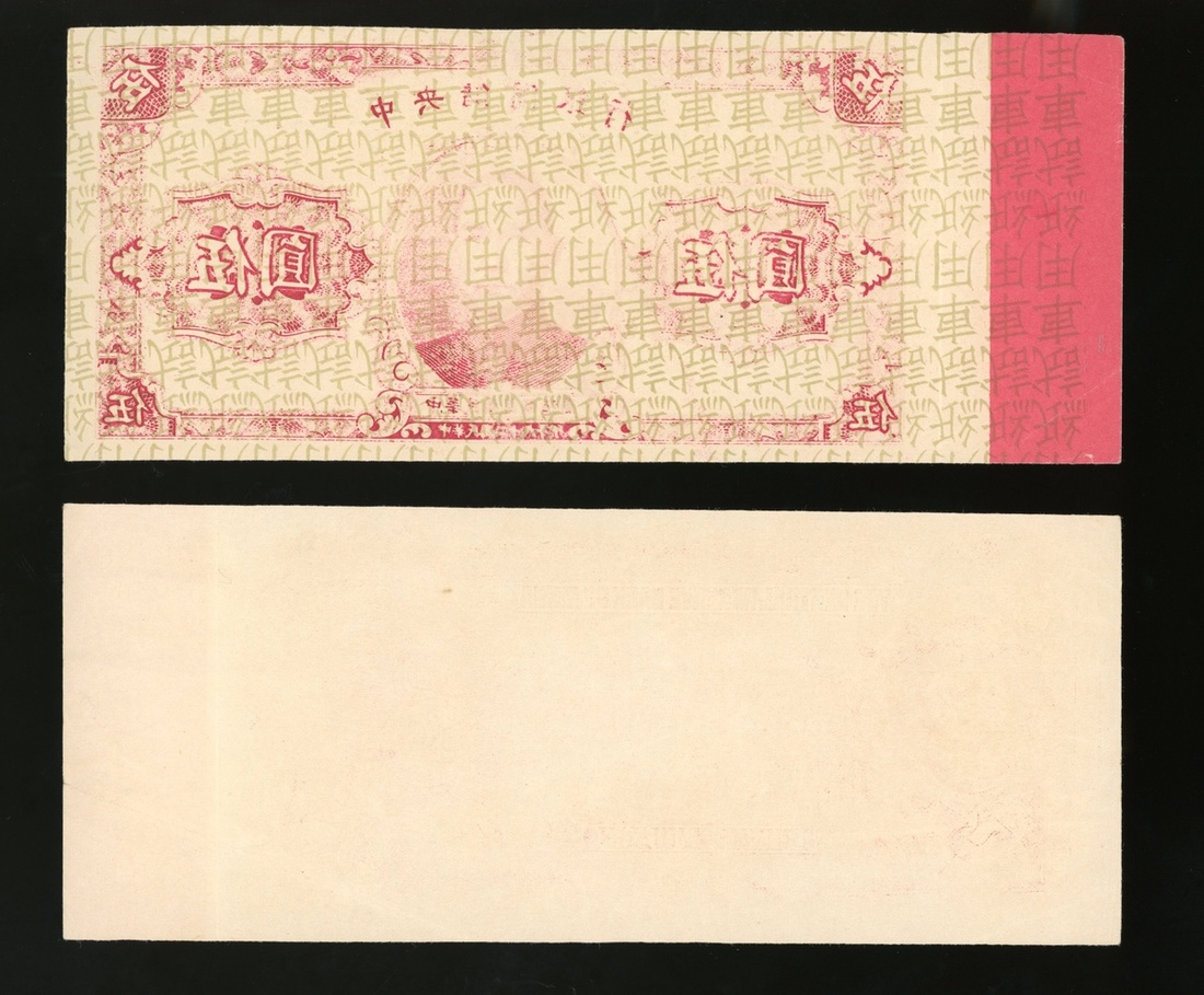Central Reserve Bank of China, 5 yuan, a pair of obverse and reverse test notes, 1940, (Pick J10), about uncirculated to uncirculated, rare seen.(2)