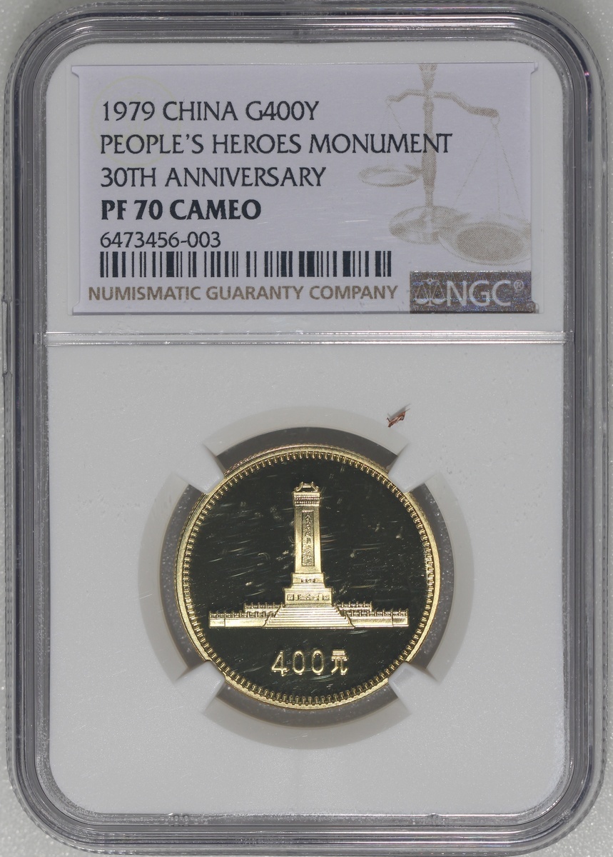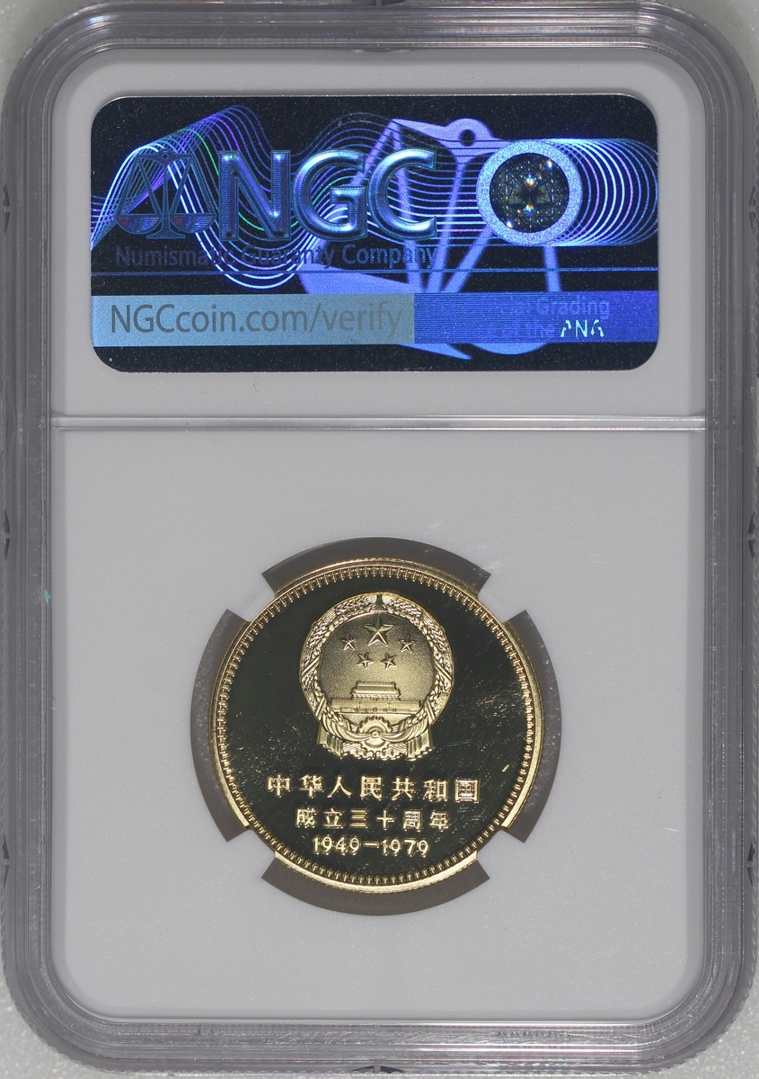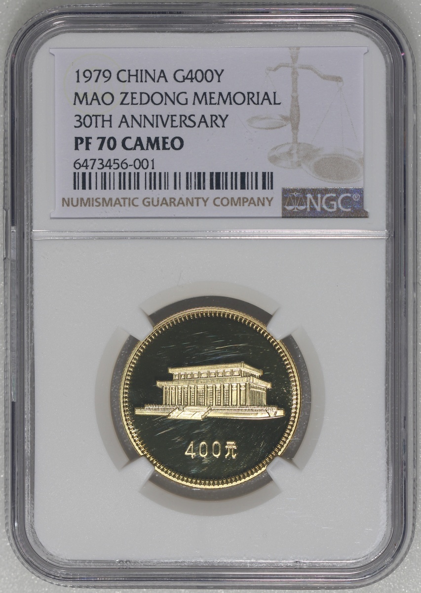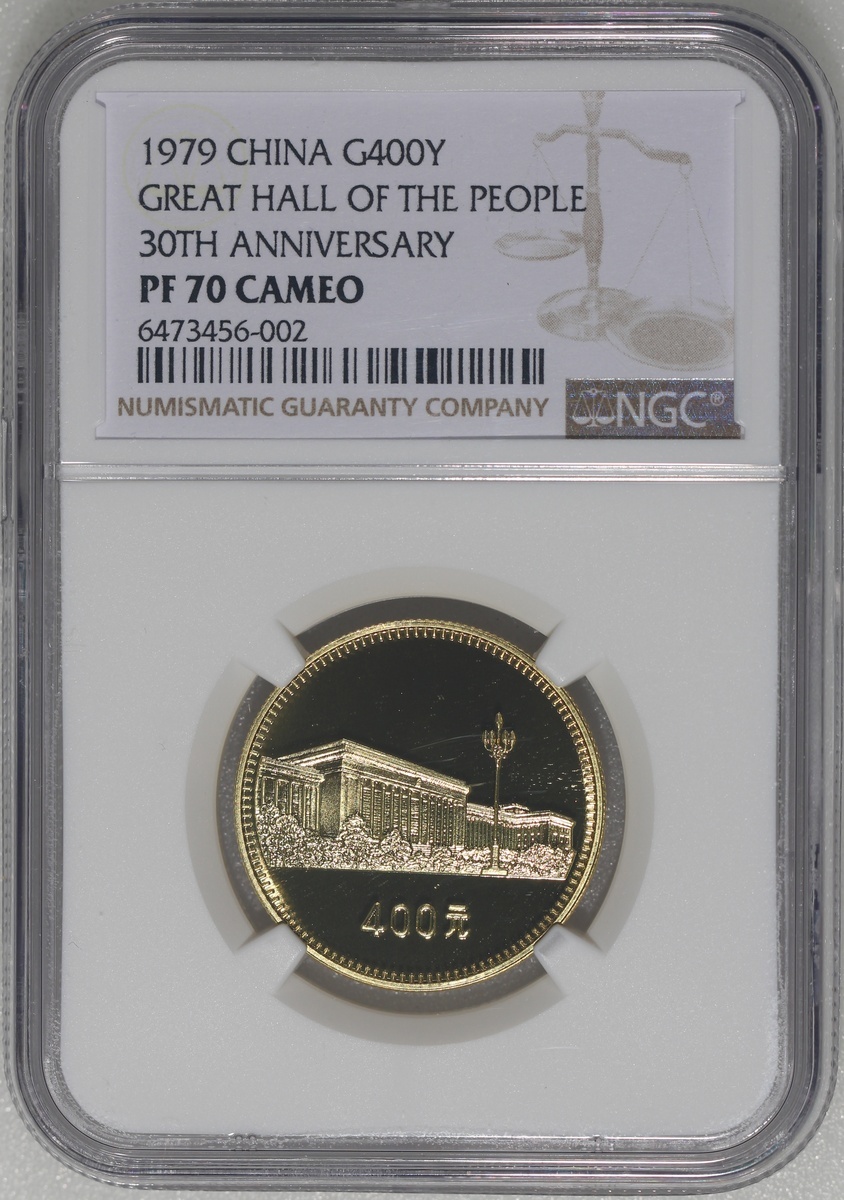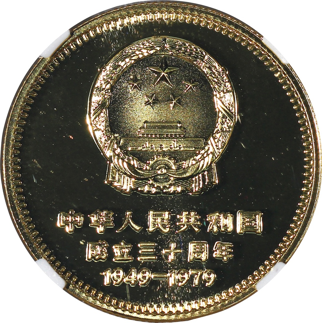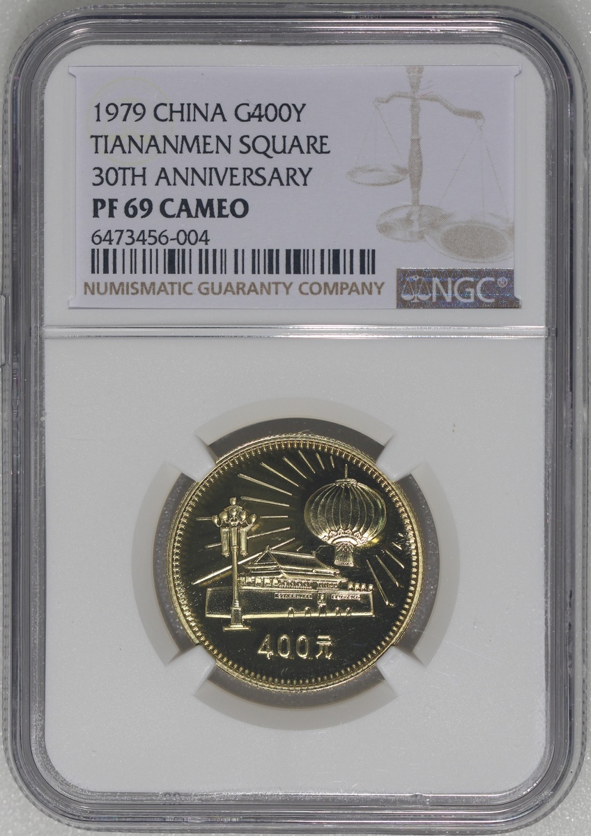 1979年建國三十週年精鑄金幣400元一組四枚,包括「人民英雄紀念碑」、「人民大會堂」、「毛主席紀念堂」及「天安門」,各重1/2盎司含22K純金,總含金量2盎司,附原盒及證書,#21534,3枚評NGC PF70 Cameo,1枚PF69 Cameo,#6473456-001-4