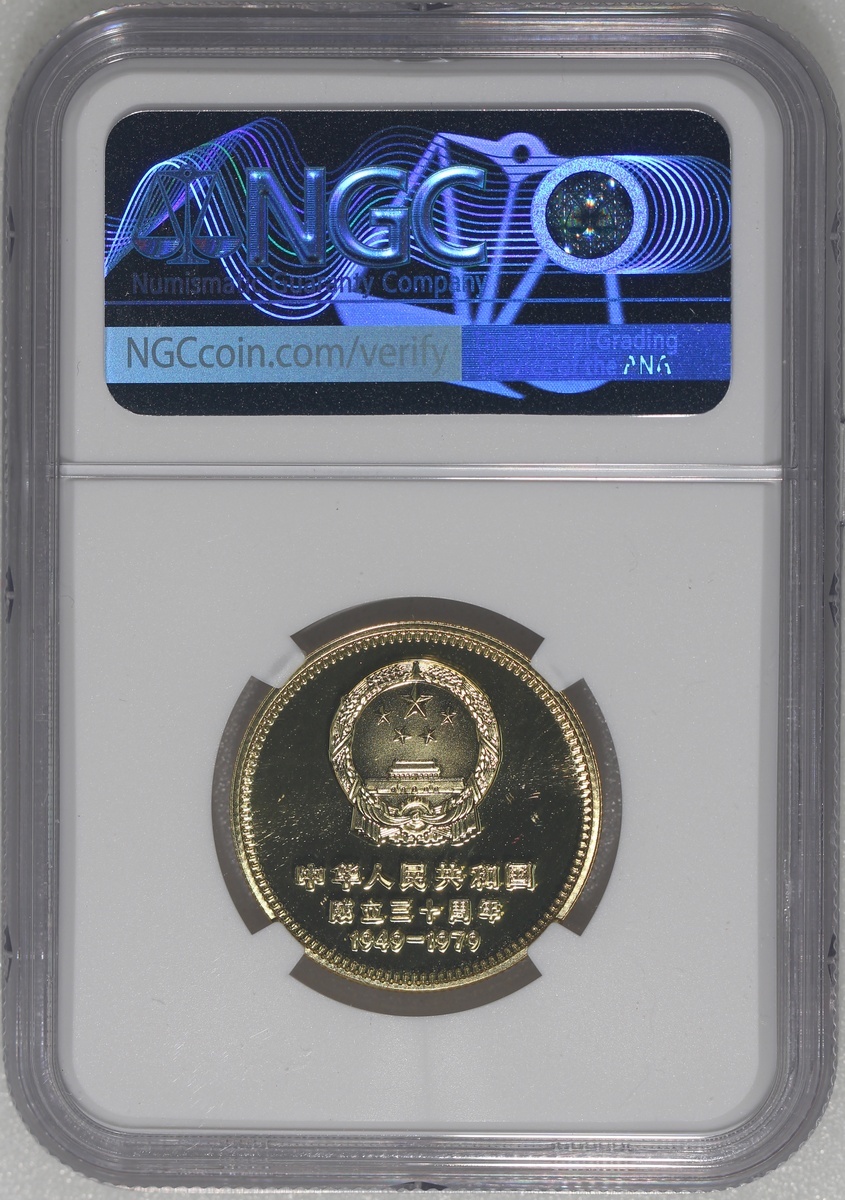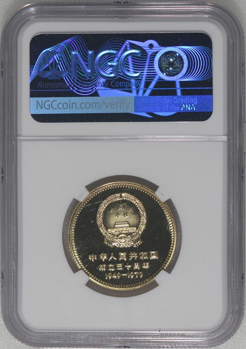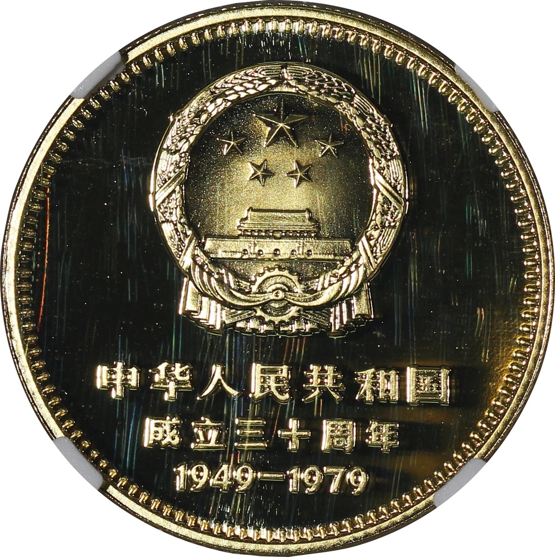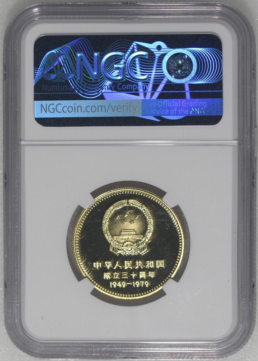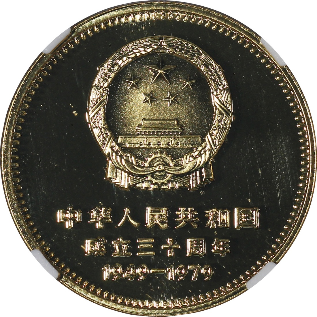 1979年建國三十週年精鑄金幣400元一組四枚,包括「人民英雄紀念碑」、「人民大會堂」、「毛主席紀念堂」及「天安門」,各重1/2盎司含22K純金,總含金量2盎司,附原盒及證書,#21534,3枚評NGC PF70 Cameo,1枚PF69 Cameo,#6473456-001-4