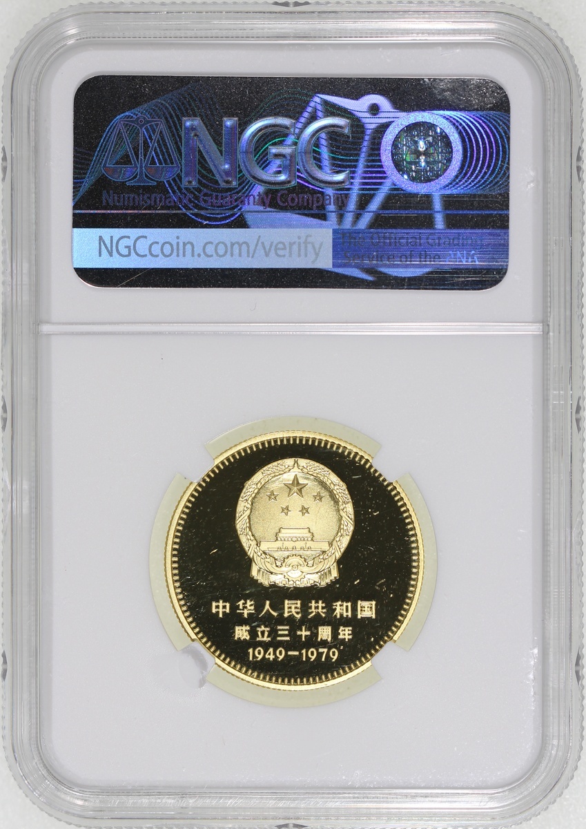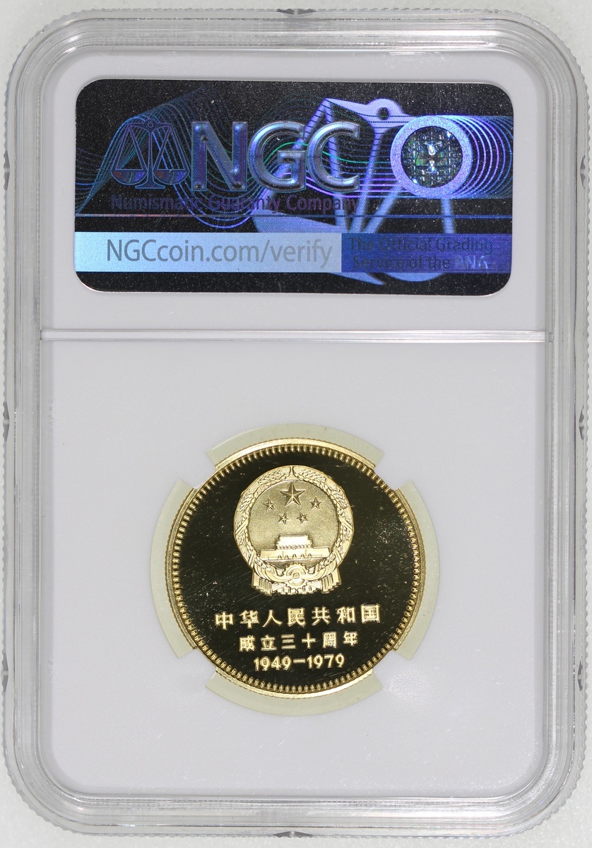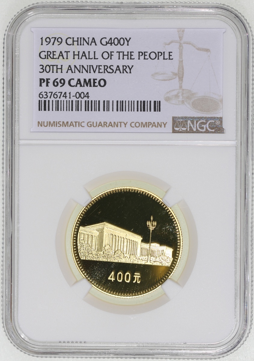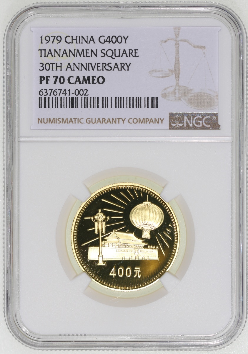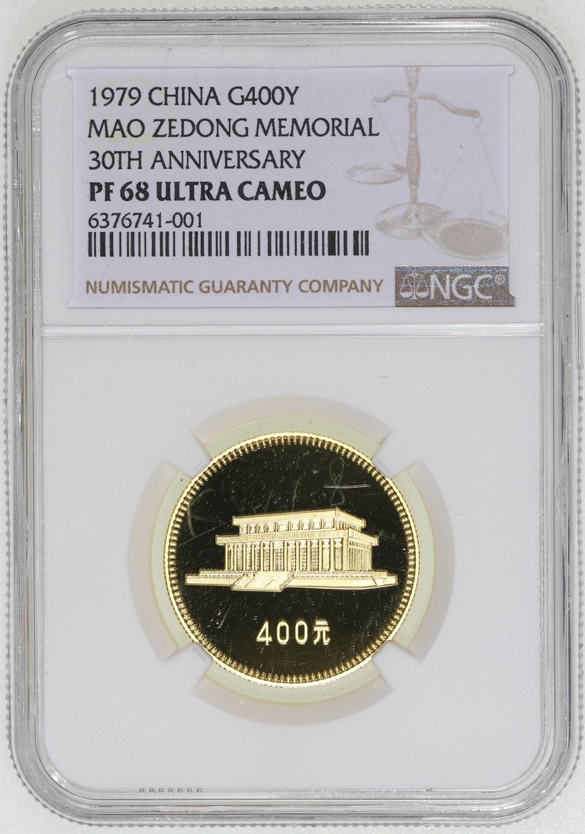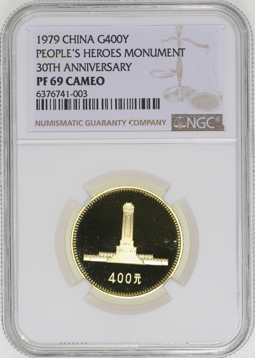 1979年建國三十週年精鑄金幣400元一組四枚,包括「天安門」,「毛主席紀念堂」,「人民大會堂」及「人民英雄紀念碑」,各重1/2盎司含22K純金,總含金量2盎司,附原盒及證書,1枚評NGC 68 Ultra Cameo, 2x PF 69 Cameo及PF 70 Cameo,#6376741-001, 003, 004及002
