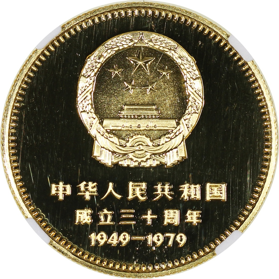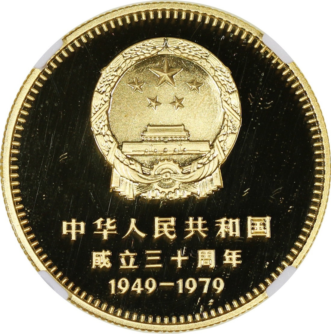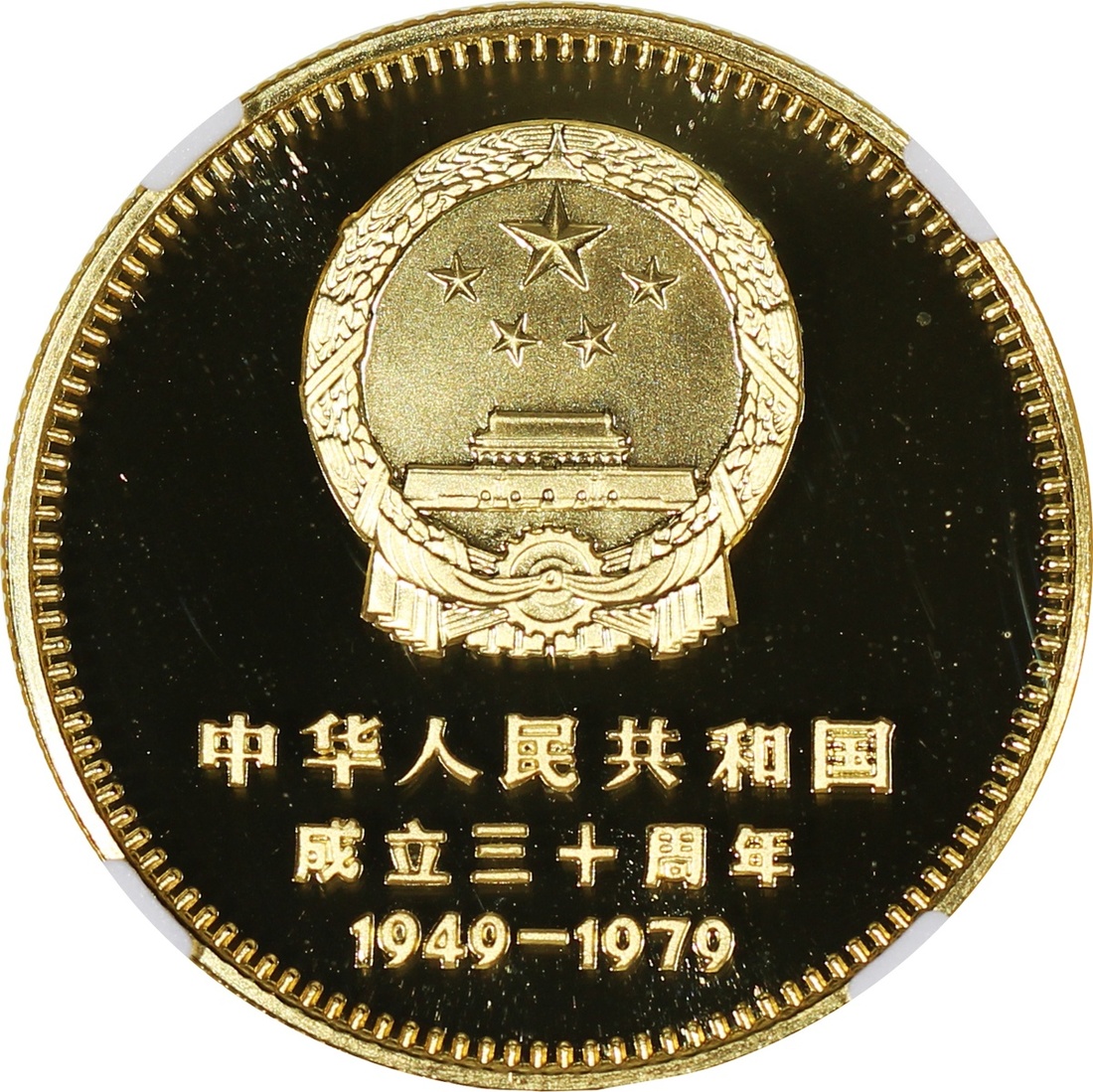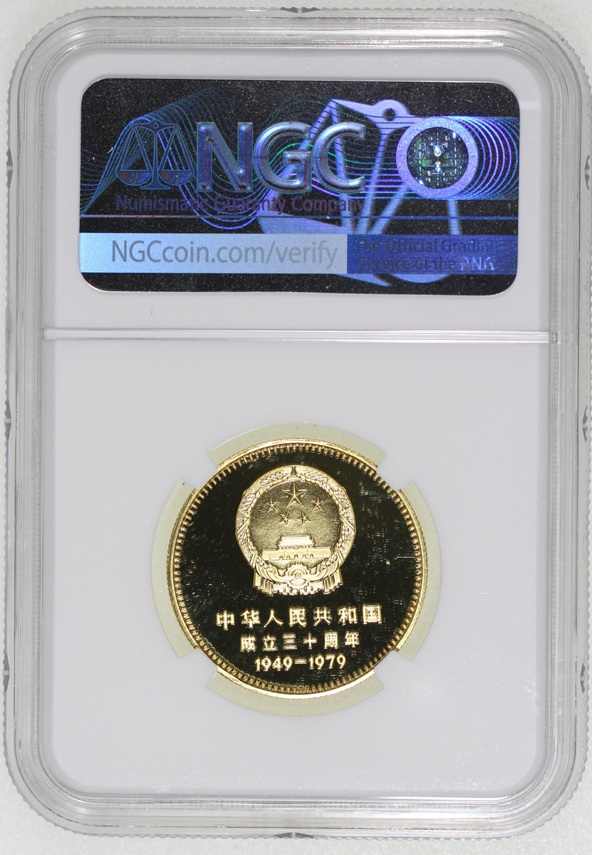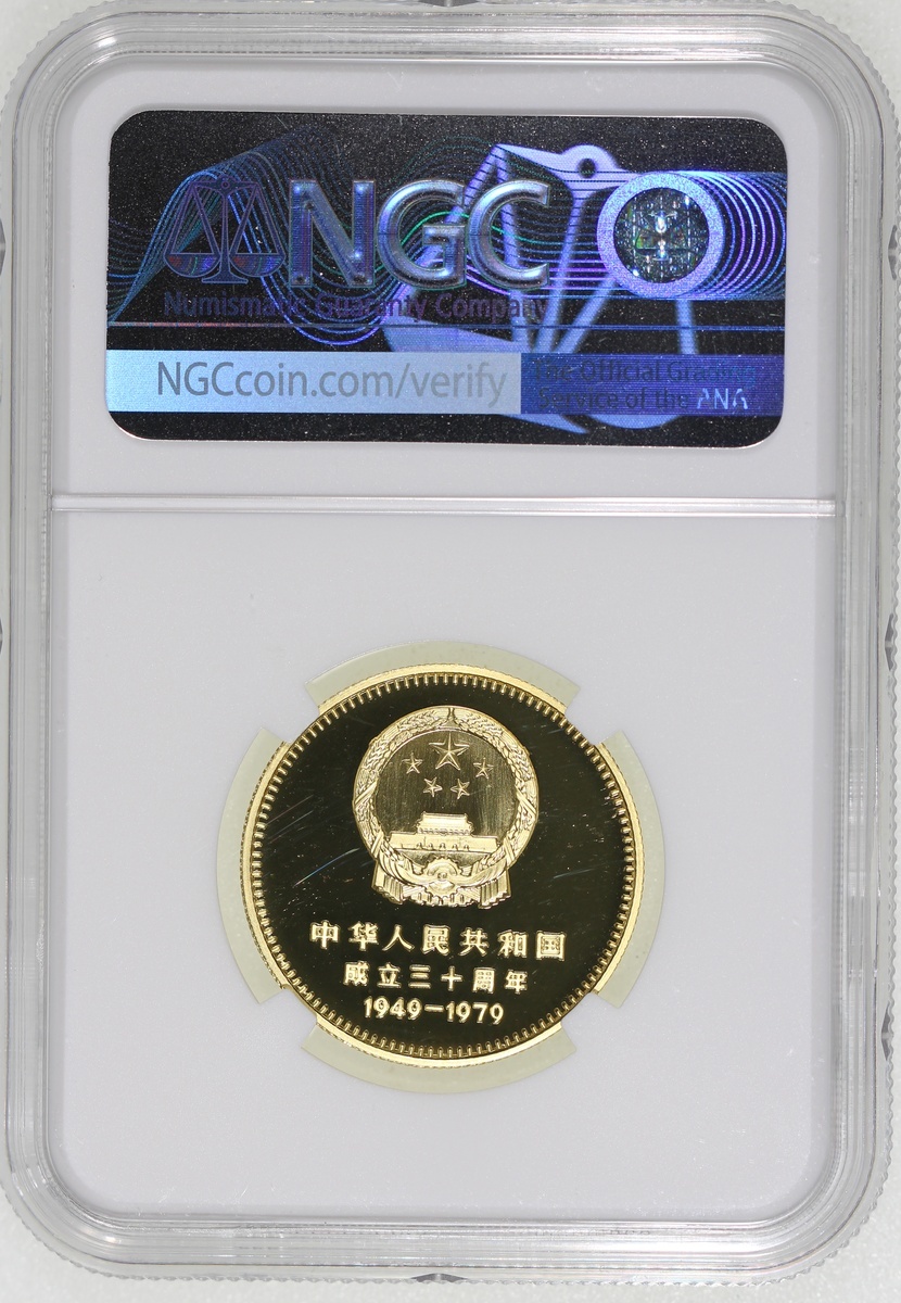 1979年建國三十週年精鑄金幣400元一組四枚,包括「天安門」,「毛主席紀念堂」,「人民大會堂」及「人民英雄紀念碑」,各重1/2盎司含22K純金,總含金量2盎司,附原盒及證書,1枚評NGC 68 Ultra Cameo, 2x PF 69 Cameo及PF 70 Cameo,#6376741-001, 003, 004及002