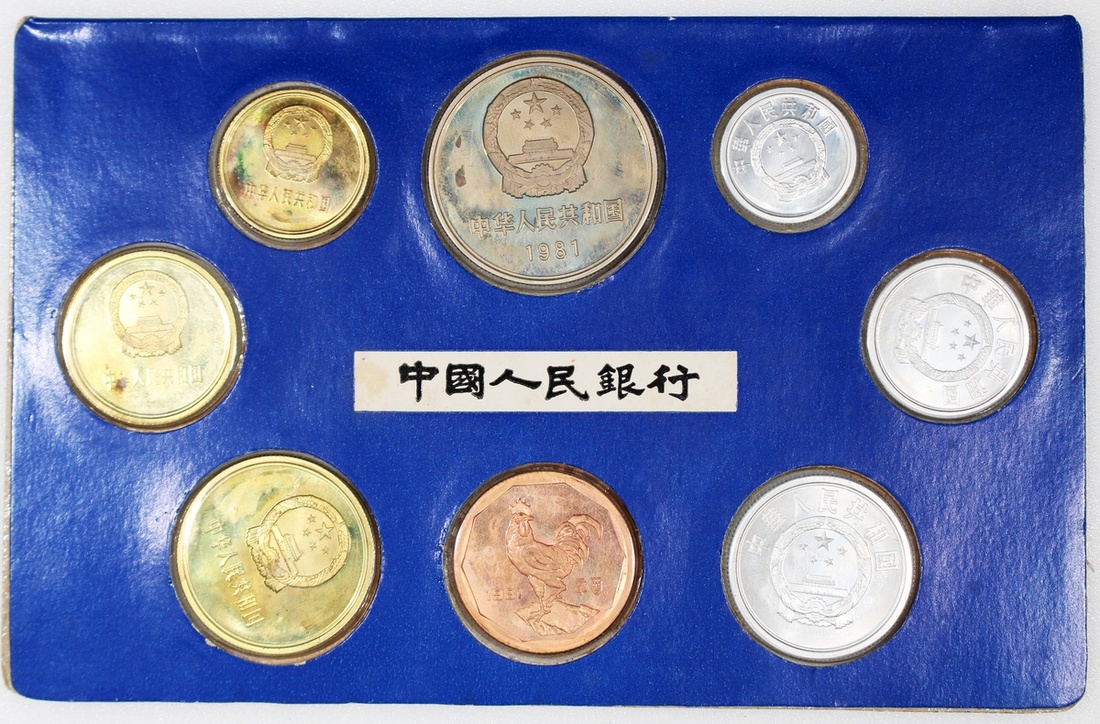 People's Republic of China, a set of uncirculated coins including 1, 2, 5 fen, 1, 2, 5 jiao, 1 yuan and together with a medal of rooster, 1981, in original plastic holder and paper case, uncirculated, several with frosty devices (8).