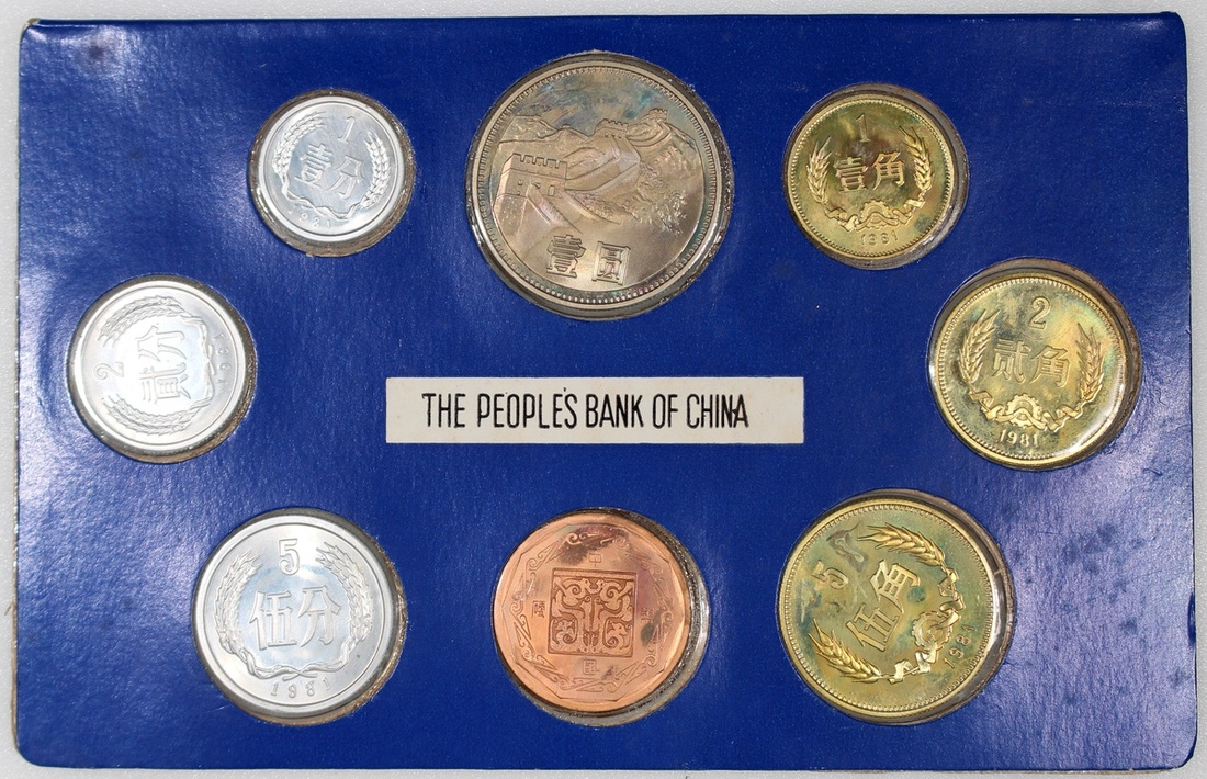 1981年中國人民銀行流通套幣一套八枚,1,2,5分、1,2,5角,壹圓,連雞年紀念章一枚,均UNC,若干有氧化,連原裝膠套及紙套