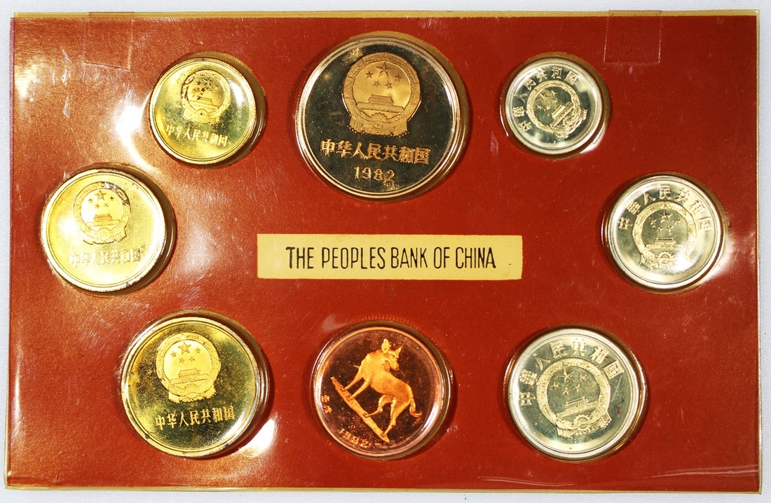 People's Republic of China, a set of uncirculated coins including 1, 2, 5 fen, 1, 2, 5 jiao, 1 yuan and together with a medal of dog, 1982, in original plastic holder and paper case, uncirculated.(8)