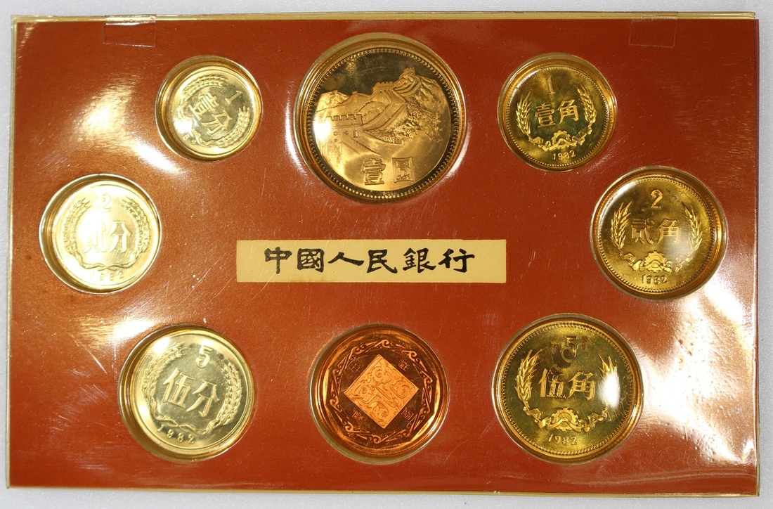 1982年中國人民銀行流通套幣一套八枚,1,2,5分、1,2,5角,壹圓,連狗年紀念章一枚,均UNC,連原裝膠套及紙套