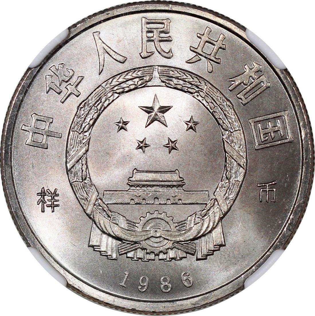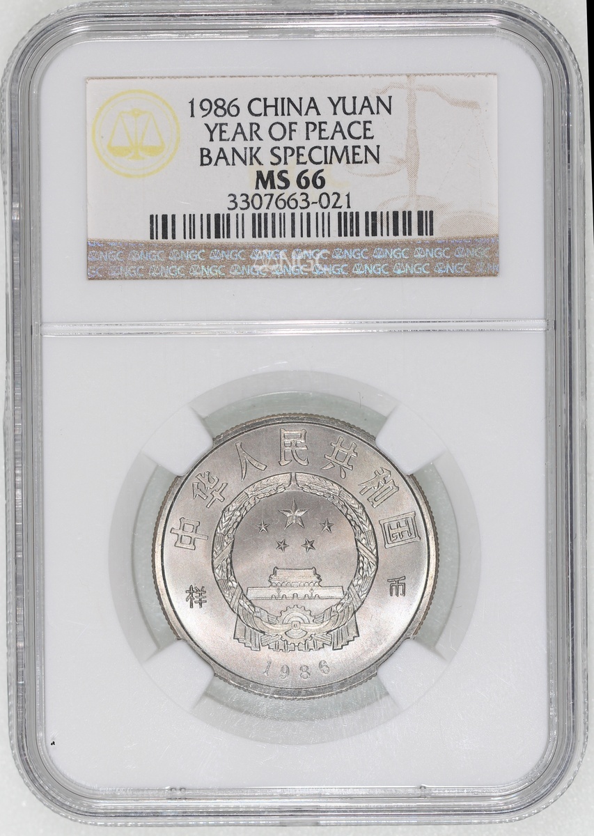 1986年中華人民共和國國際和平年壹圓樣幣,NGC MS66, #3307663-021,少見