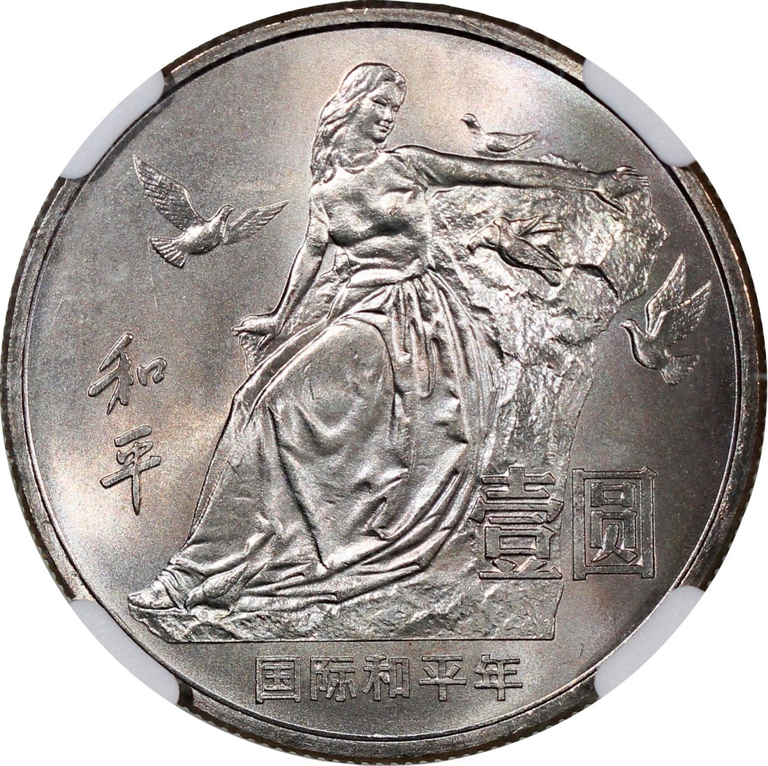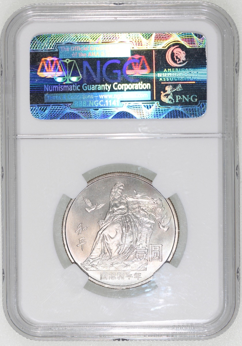 People's Republic of China, 1 yuan, bank specimen, 1986, International Year of Peace, NGC MS66, #3307663-021. Very rare