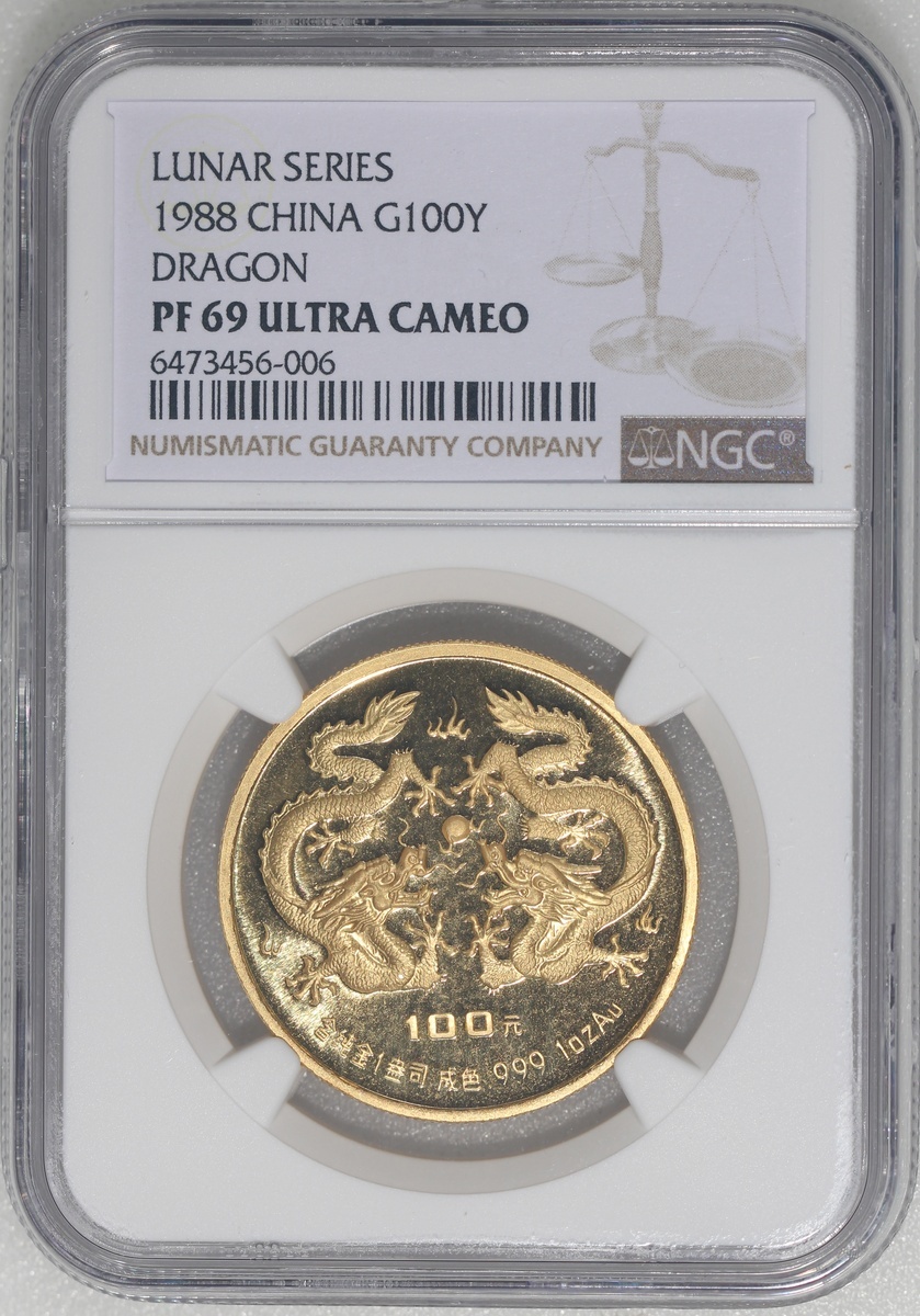 1988年中國十二生肖龍年金幣100元,連原盒,NGC PF69 Ultra Cameo,#6473456-006