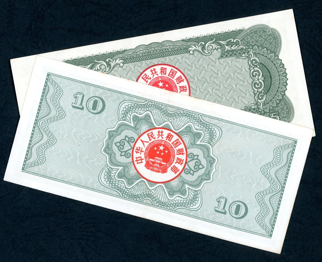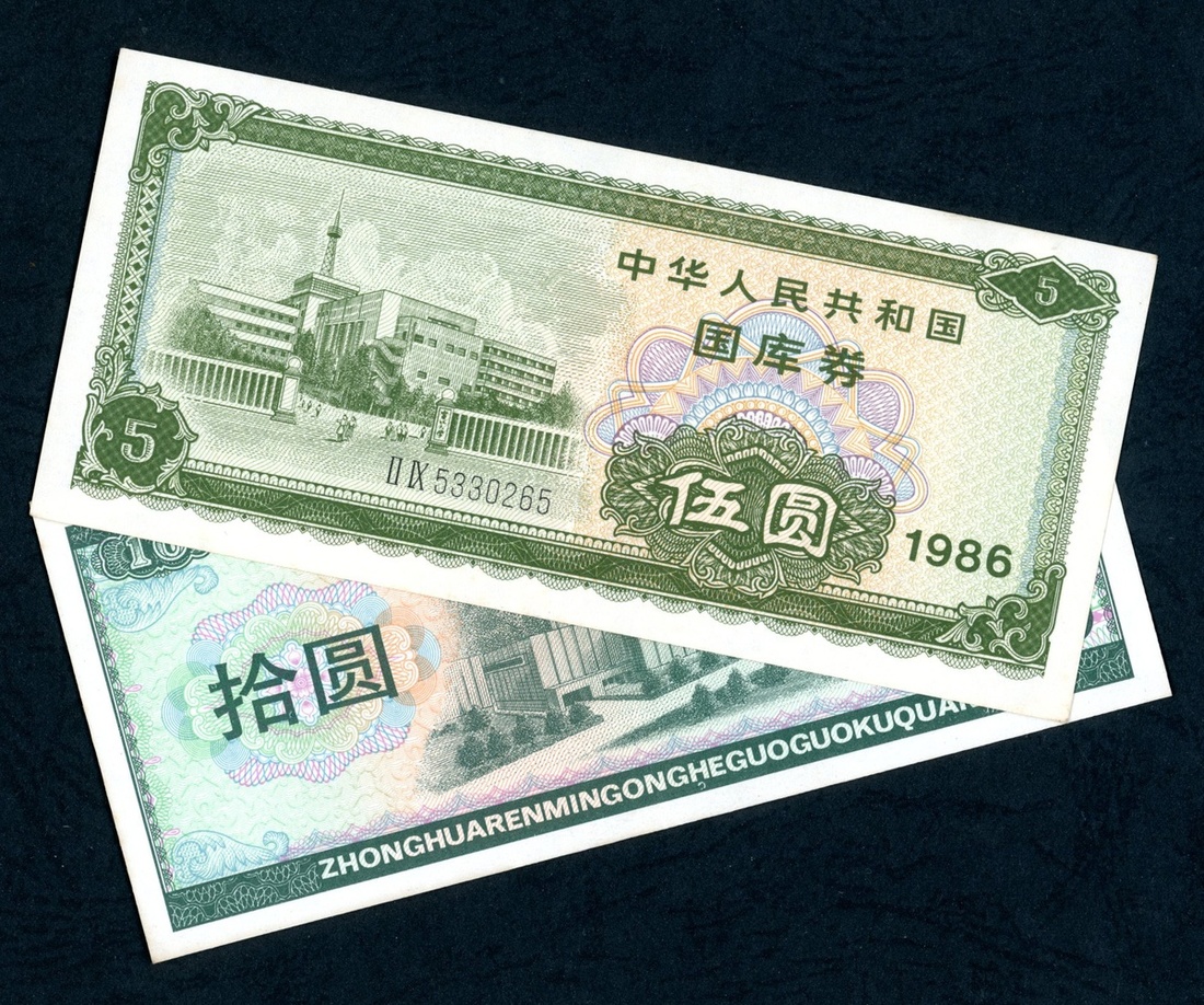 中華人民共和國國庫券2枚一組,包括1986年5元及1987年10元,均帶中心摺痕