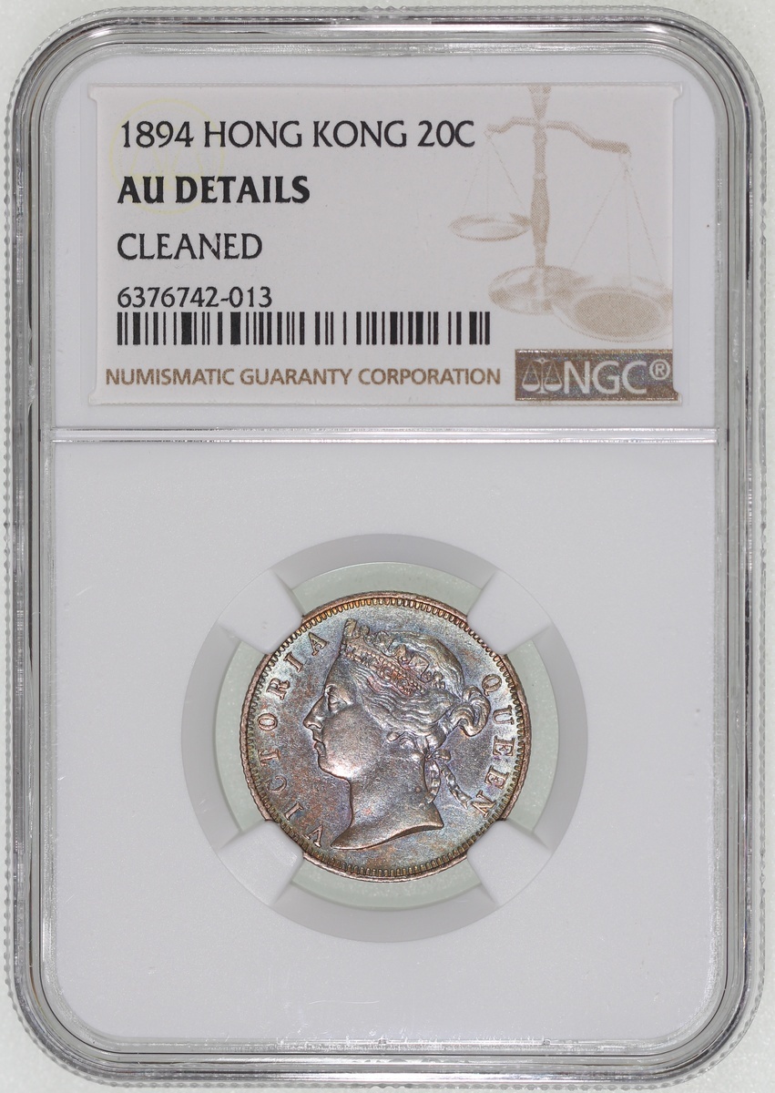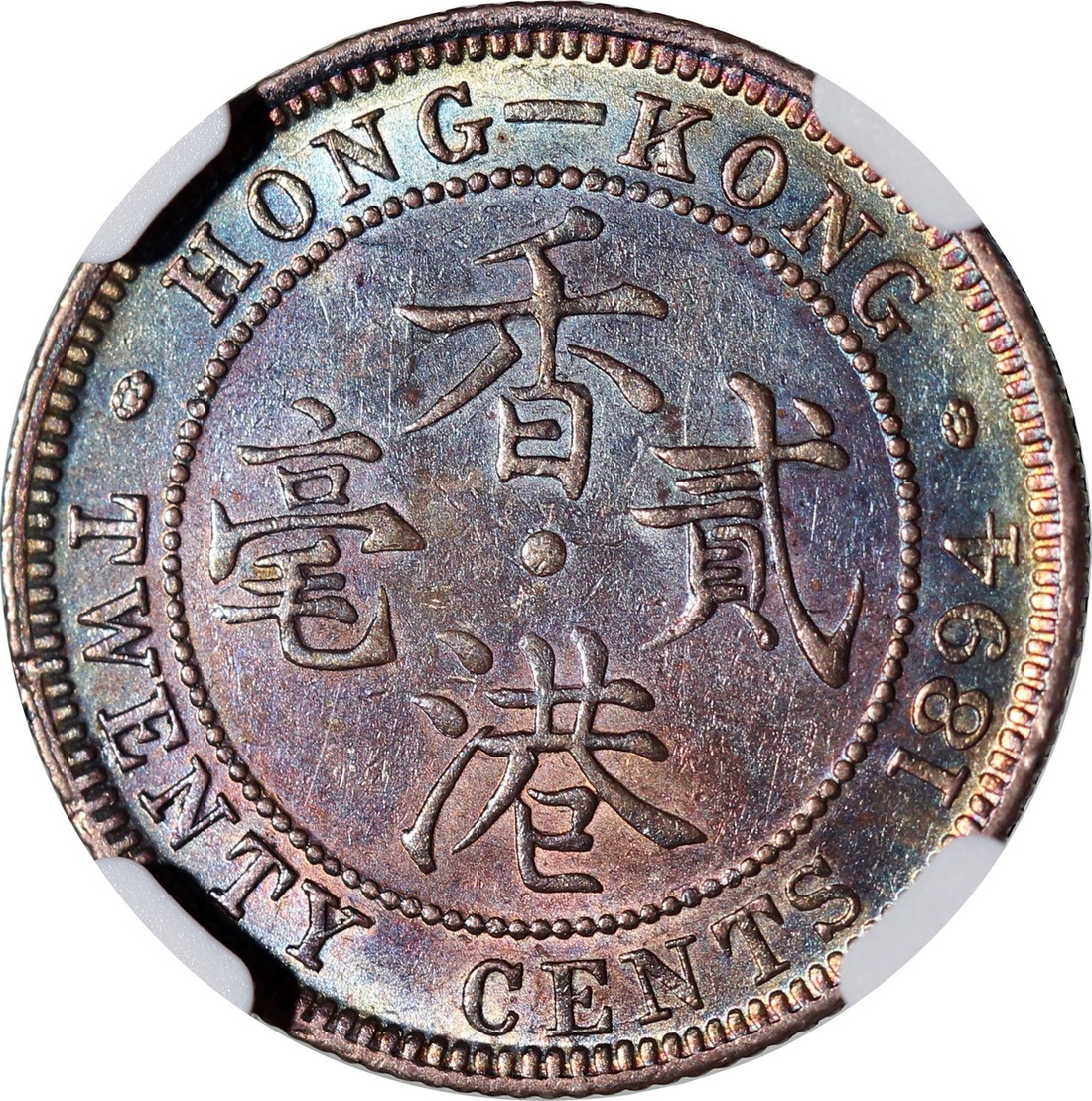 Hong Kong, silver 20 cents, 1894, Victoria on obverse, evenly toned, NGC AU Details, cleaned. Cert.#6376742-013