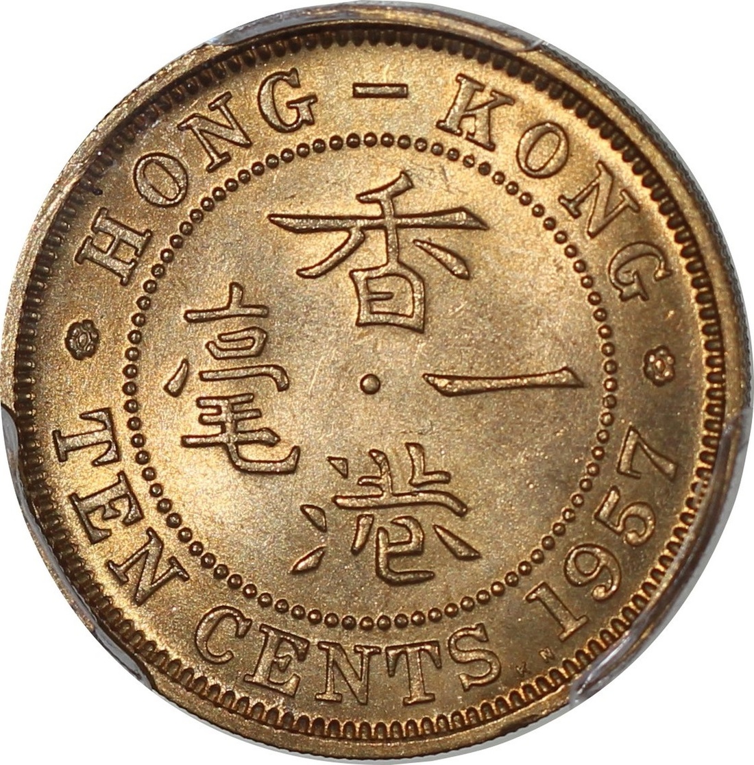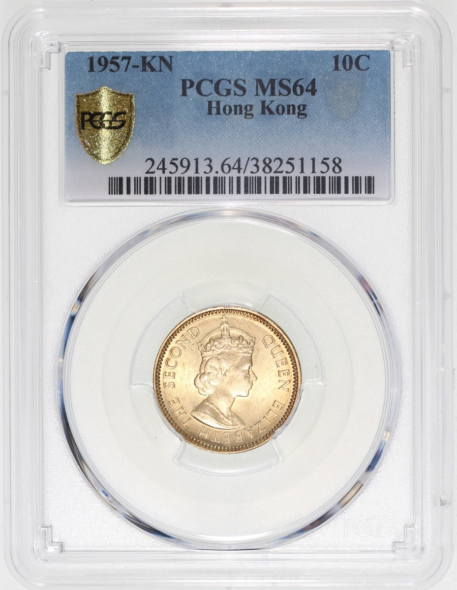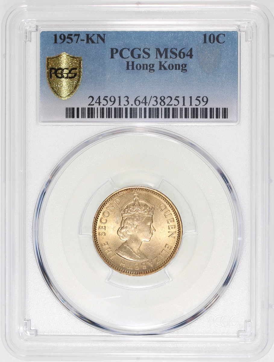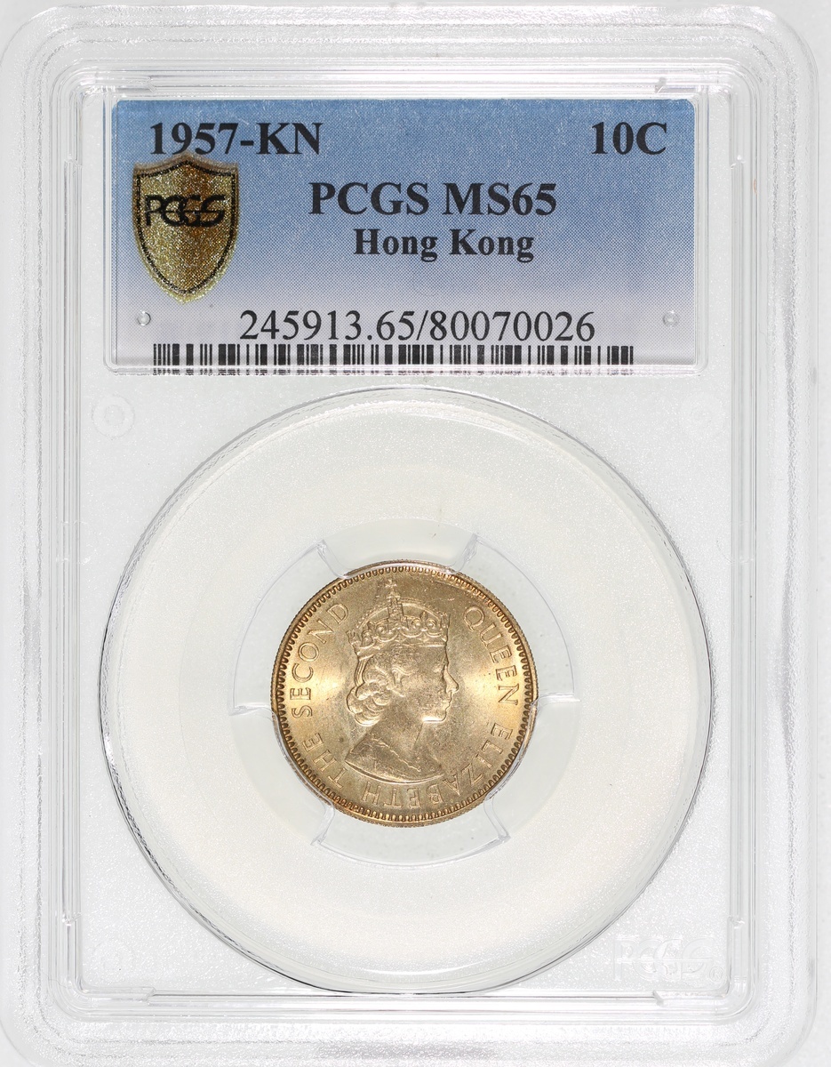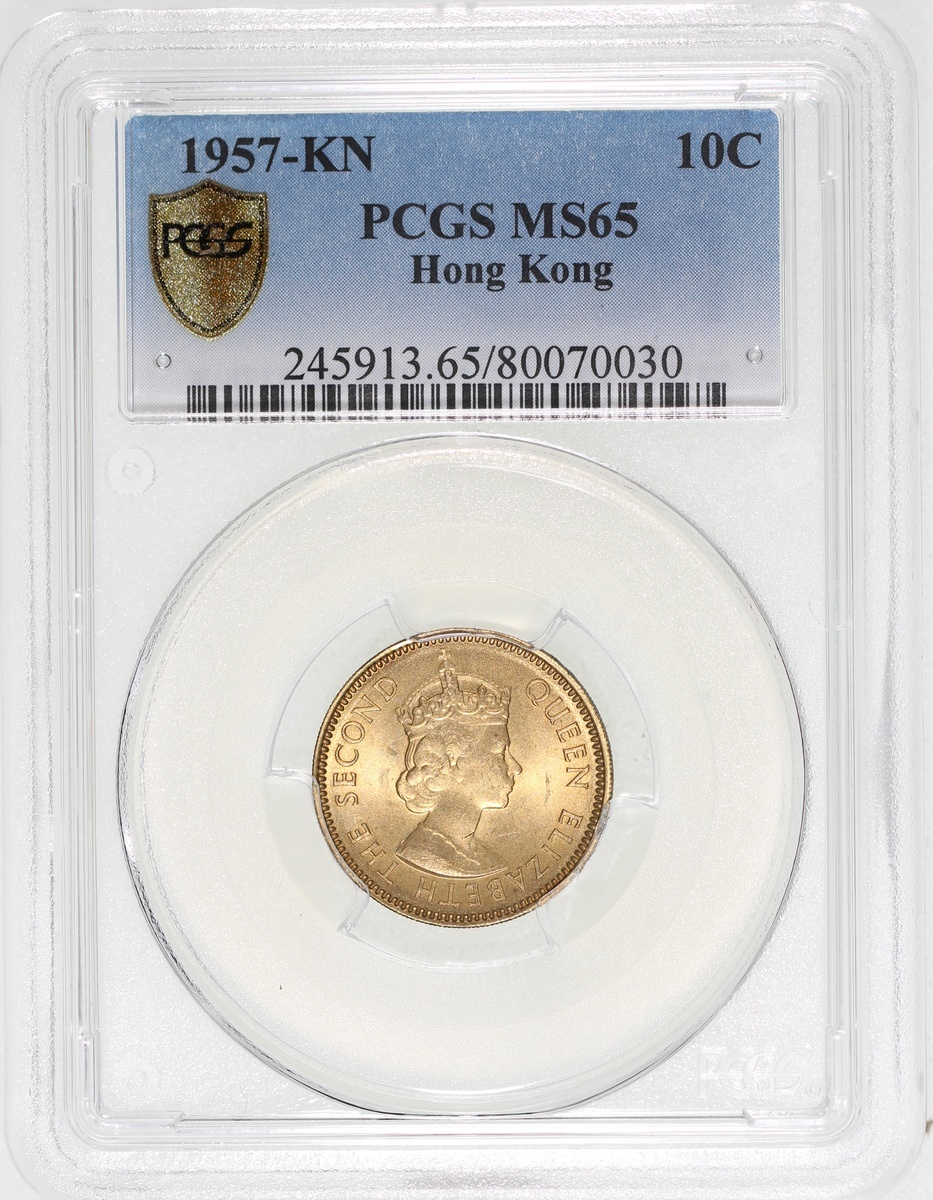 Hong Kong, a lot of 6x nickel brass 10 cents, including 1955, 1956-H and 4x 1957-KN, all PCGS graded, MS62, MS63, 2x MS64, 2x MS65.(6) Cert.# 39687871, 39687873,38521158, 38521159, 80070026, 80070030, 39853645, 39853648, 37573971, 37573976