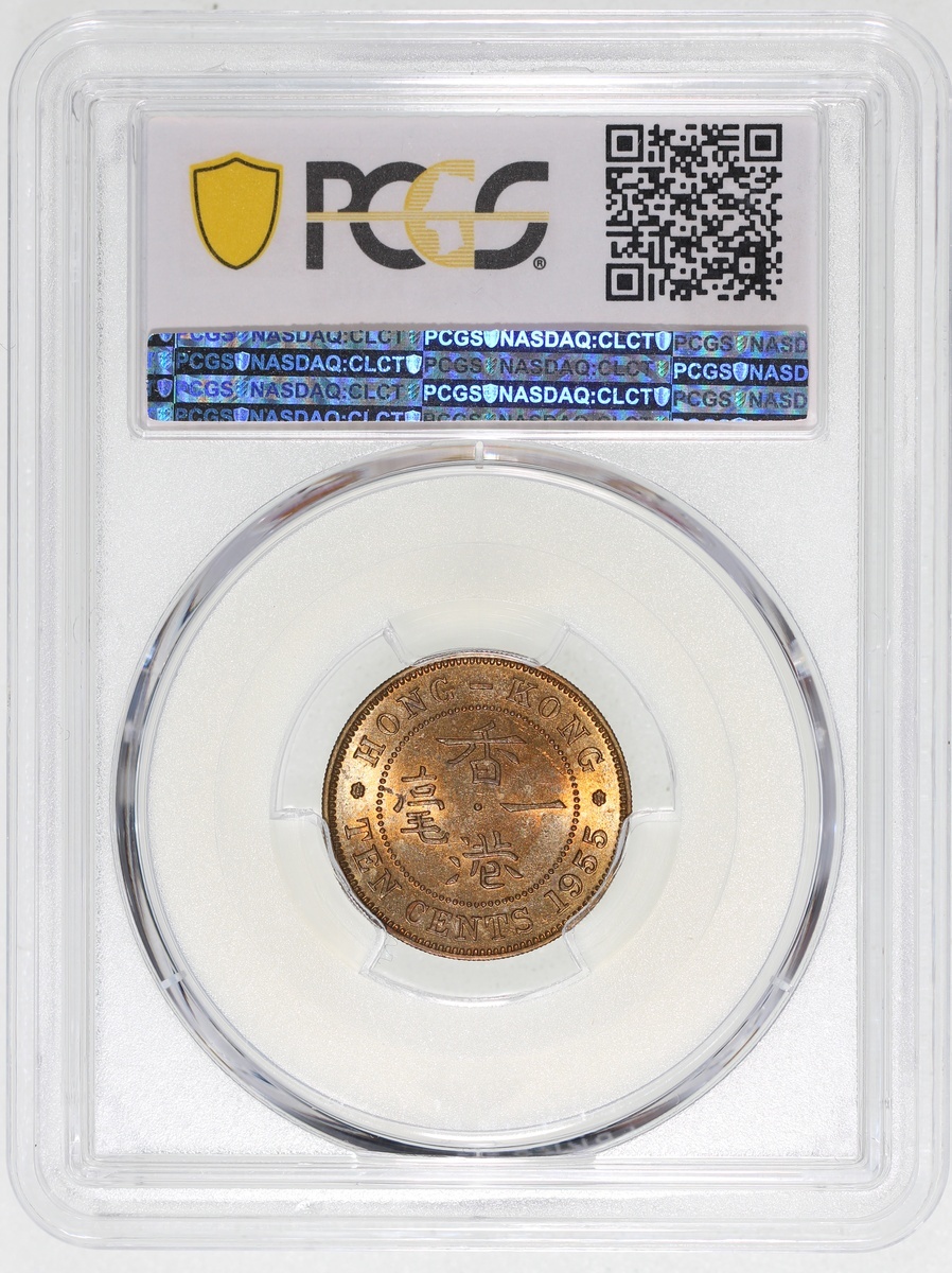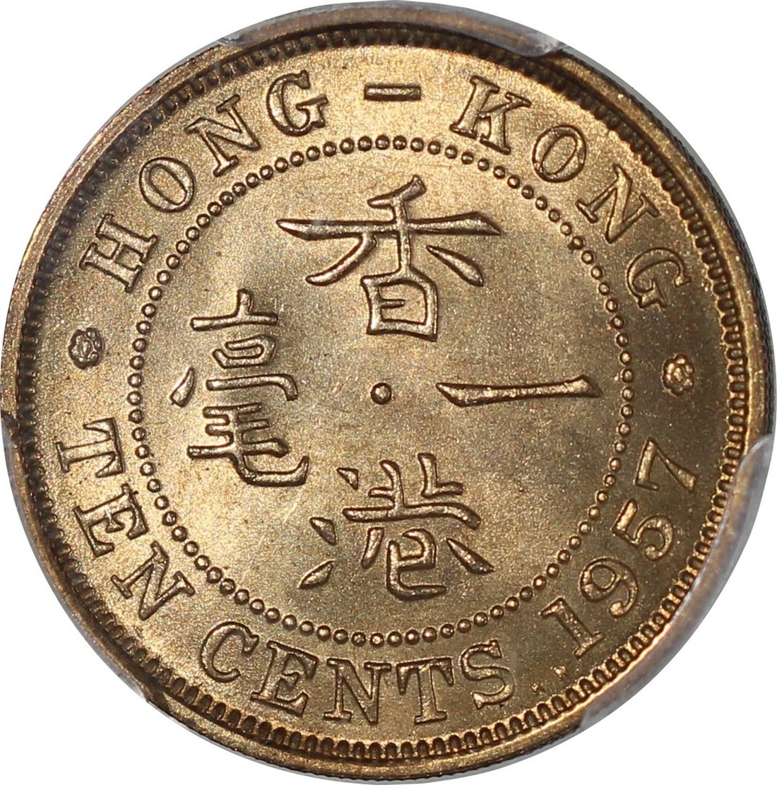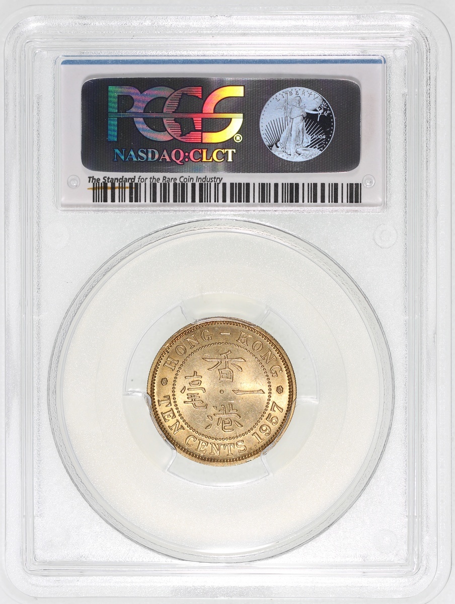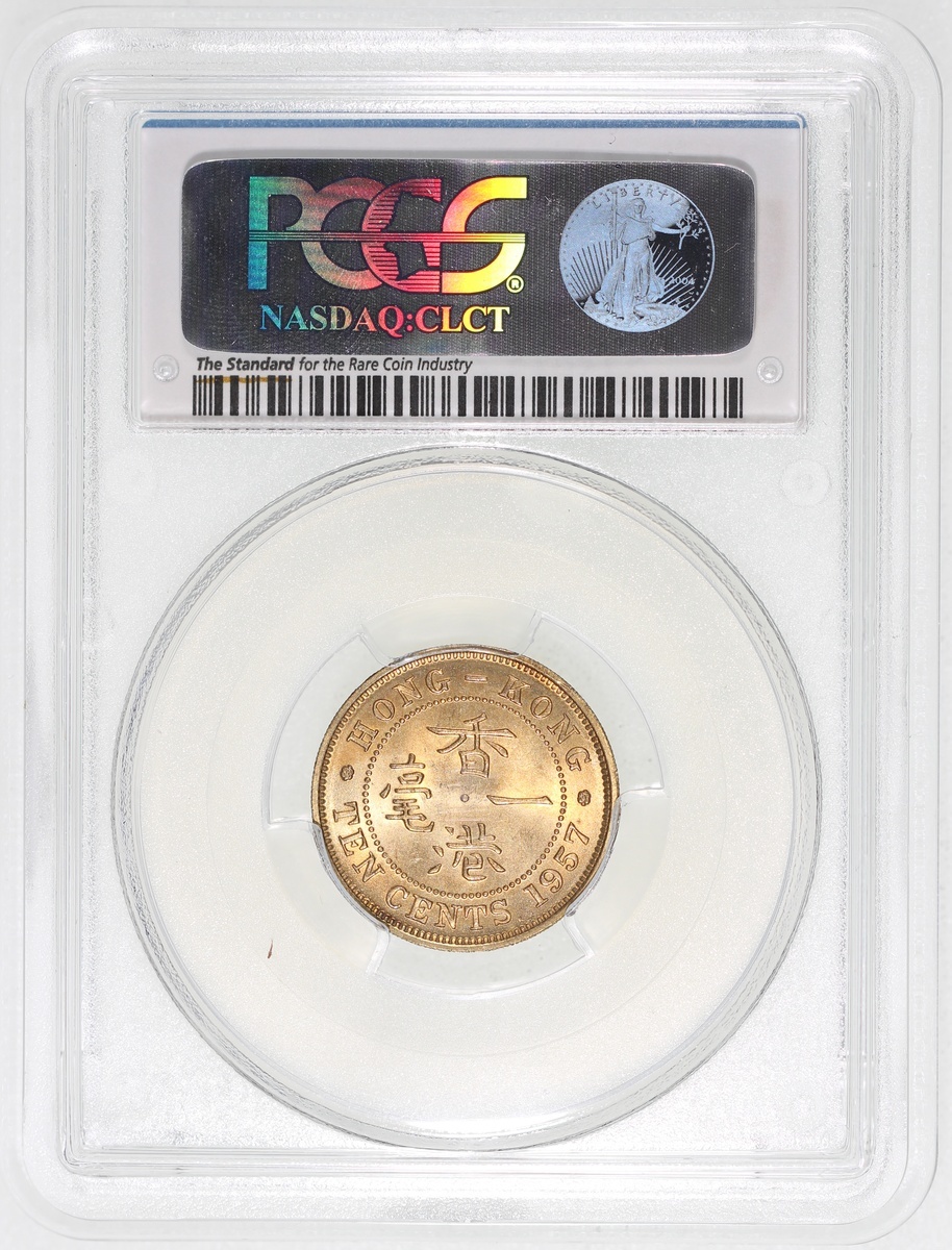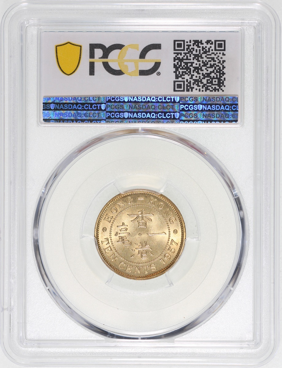 Hong Kong, a lot of 6x nickel brass 10 cents, including 1955, 1956-H and 4x 1957-KN, all PCGS graded, MS62, MS63, 2x MS64, 2x MS65.(6) Cert.# 39687871, 39687873,38521158, 38521159, 80070026, 80070030, 39853645, 39853648, 37573971, 37573976