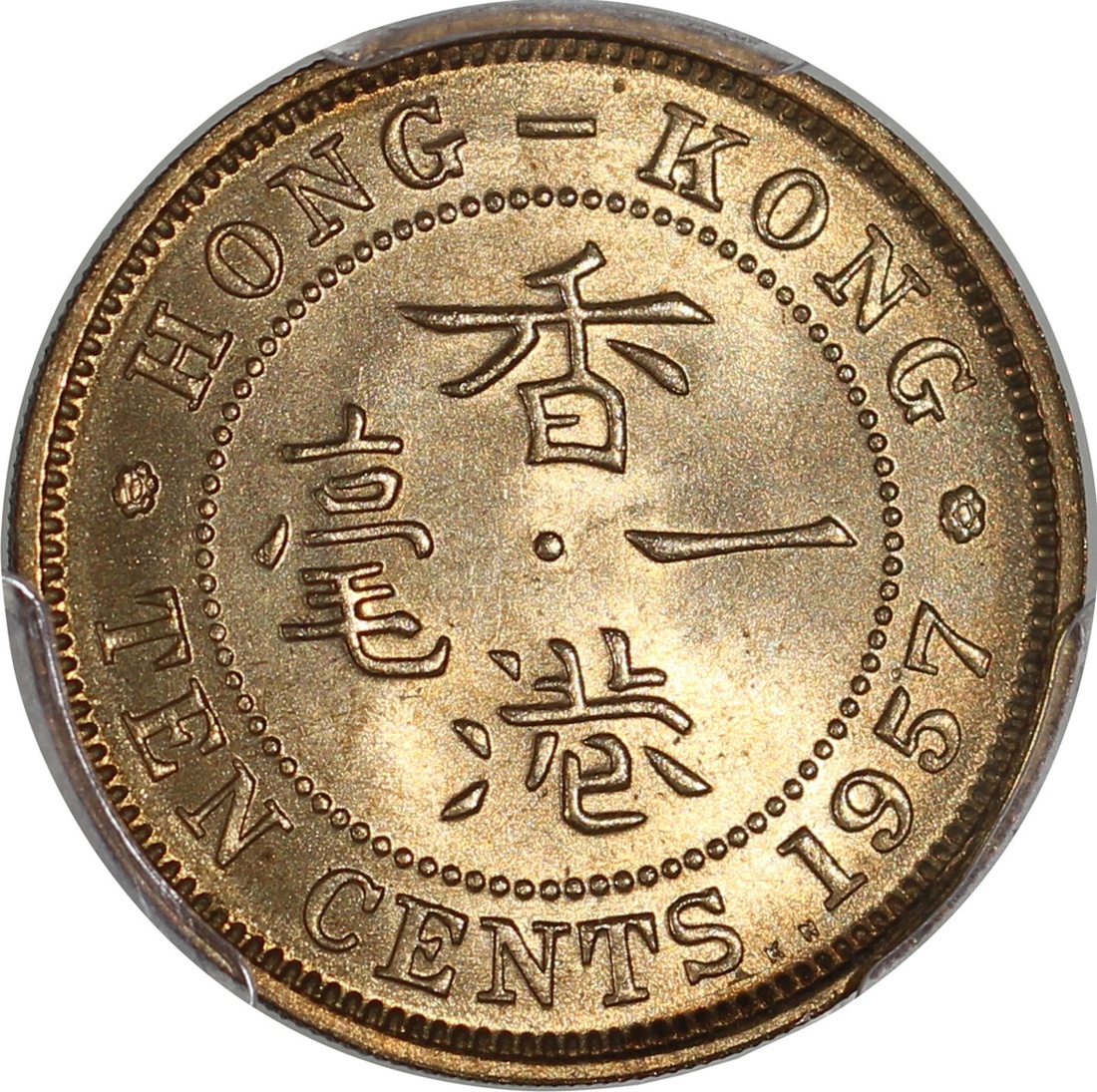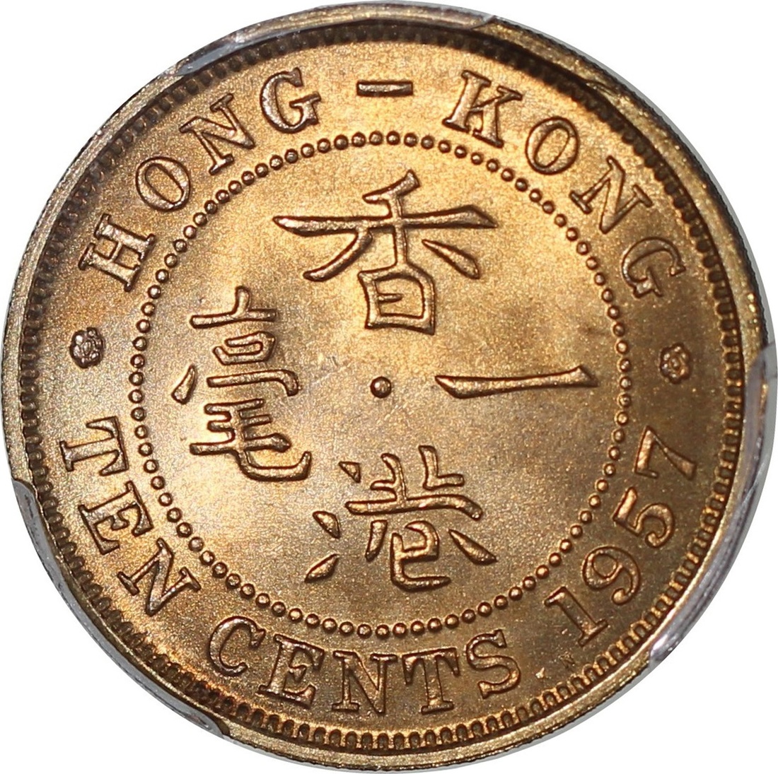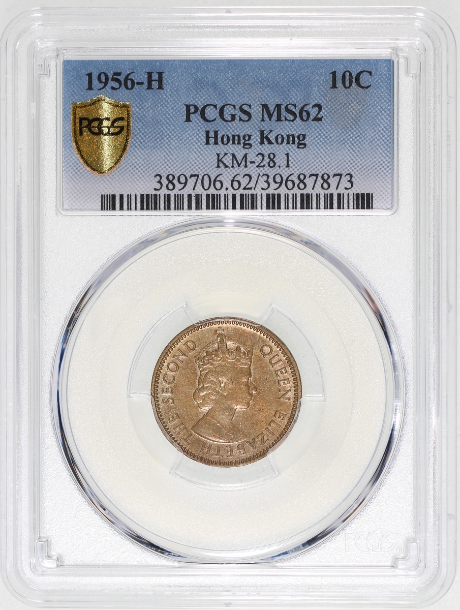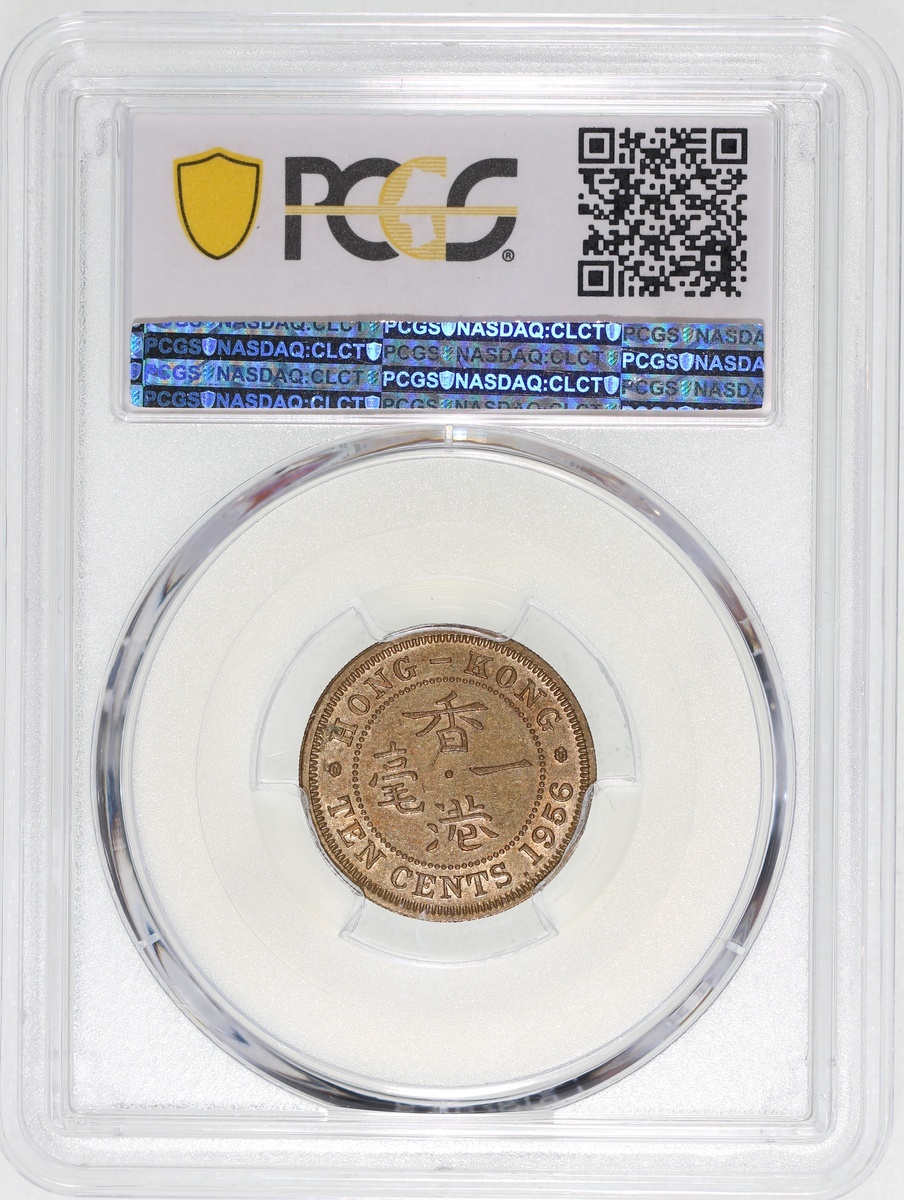 Hong Kong, a lot of 6x nickel brass 10 cents, including 1955, 1956-H and 4x 1957-KN, all PCGS graded, MS62, MS63, 2x MS64, 2x MS65.(6) Cert.# 39687871, 39687873,38521158, 38521159, 80070026, 80070030, 39853645, 39853648, 37573971, 37573976