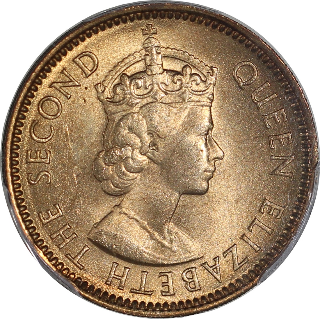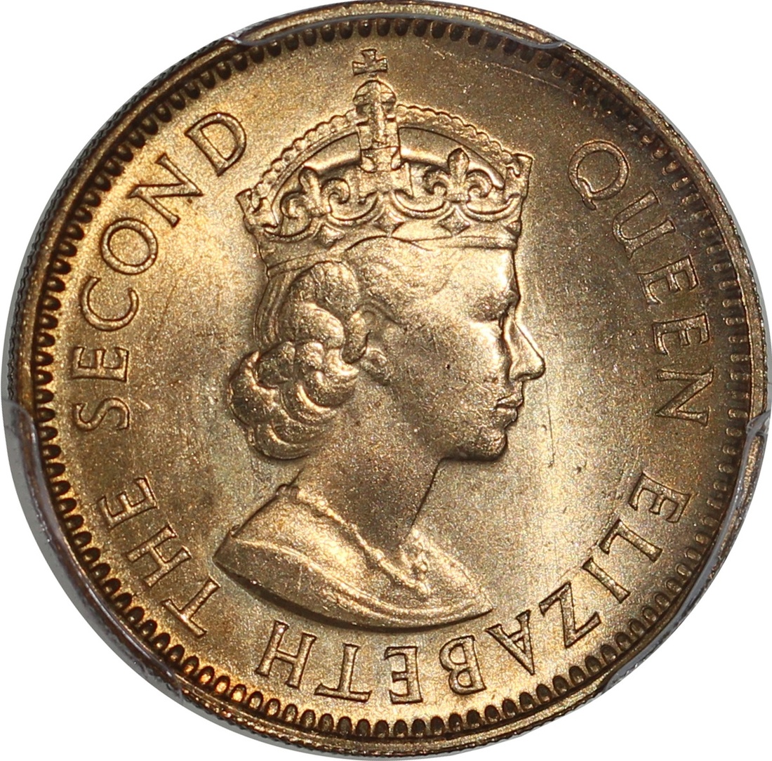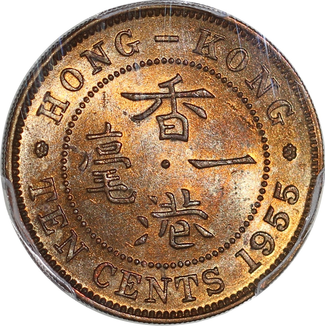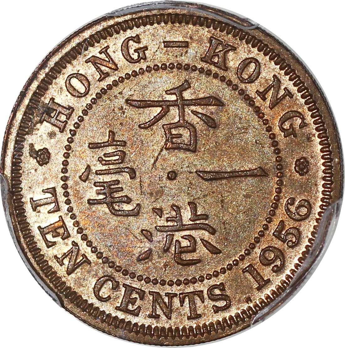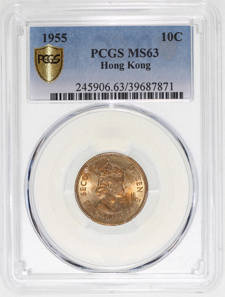 Hong Kong, a lot of 6x nickel brass 10 cents, including 1955, 1956-H and 4x 1957-KN, all PCGS graded, MS62, MS63, 2x MS64, 2x MS65.(6) Cert.# 39687871, 39687873,38521158, 38521159, 80070026, 80070030, 39853645, 39853648, 37573971, 37573976