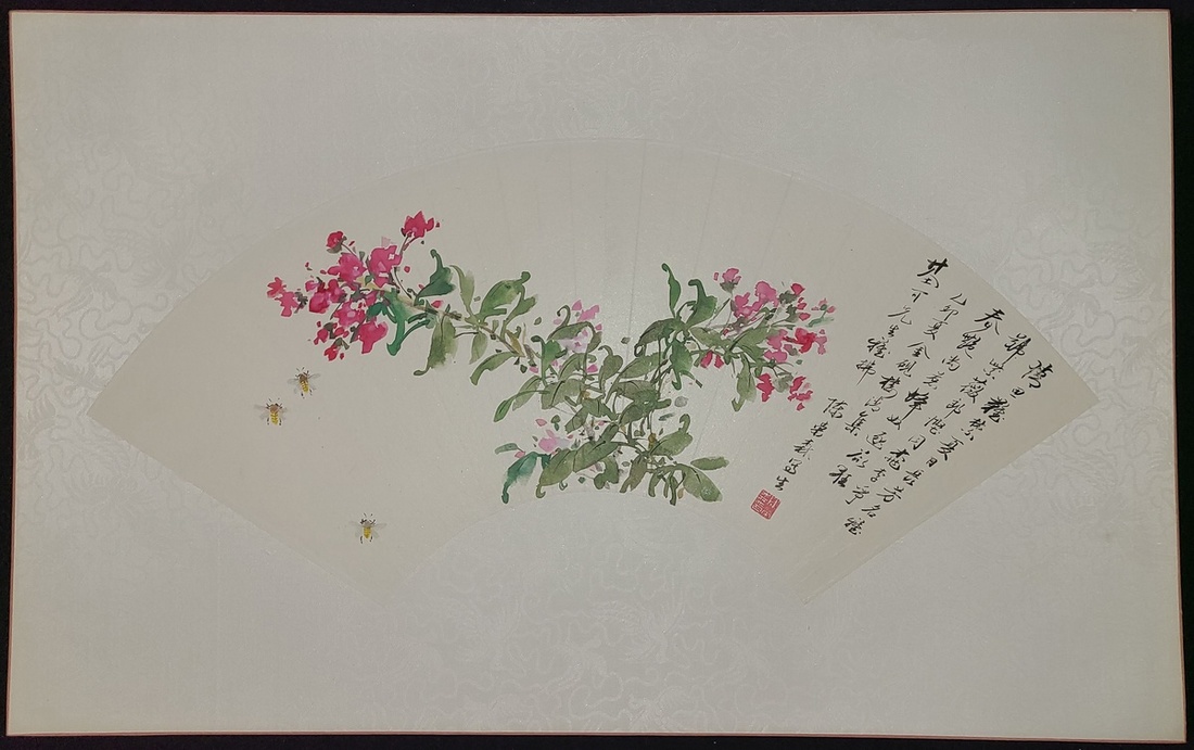 Chan Wing Sum "Flower and bees" on fan. Painted in 1975. Painting size: 24x52cm