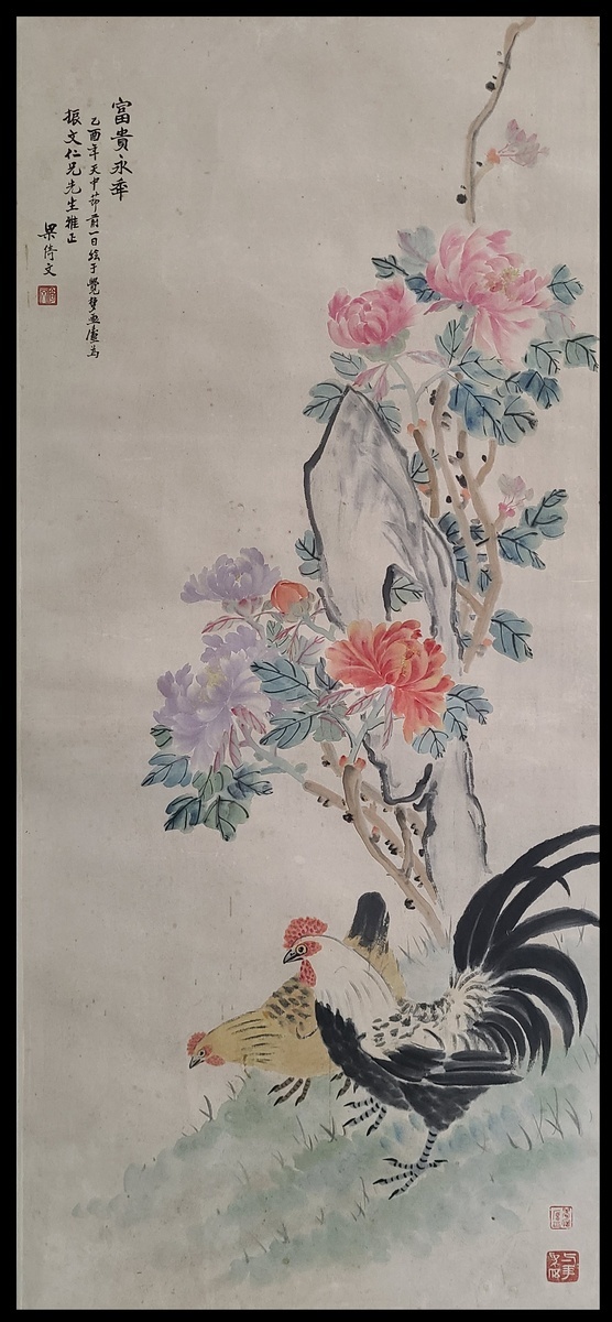 Liang Ti Wen's flower and bird painting in colour. Hanging scroll. Painting size: 42x92.5cm