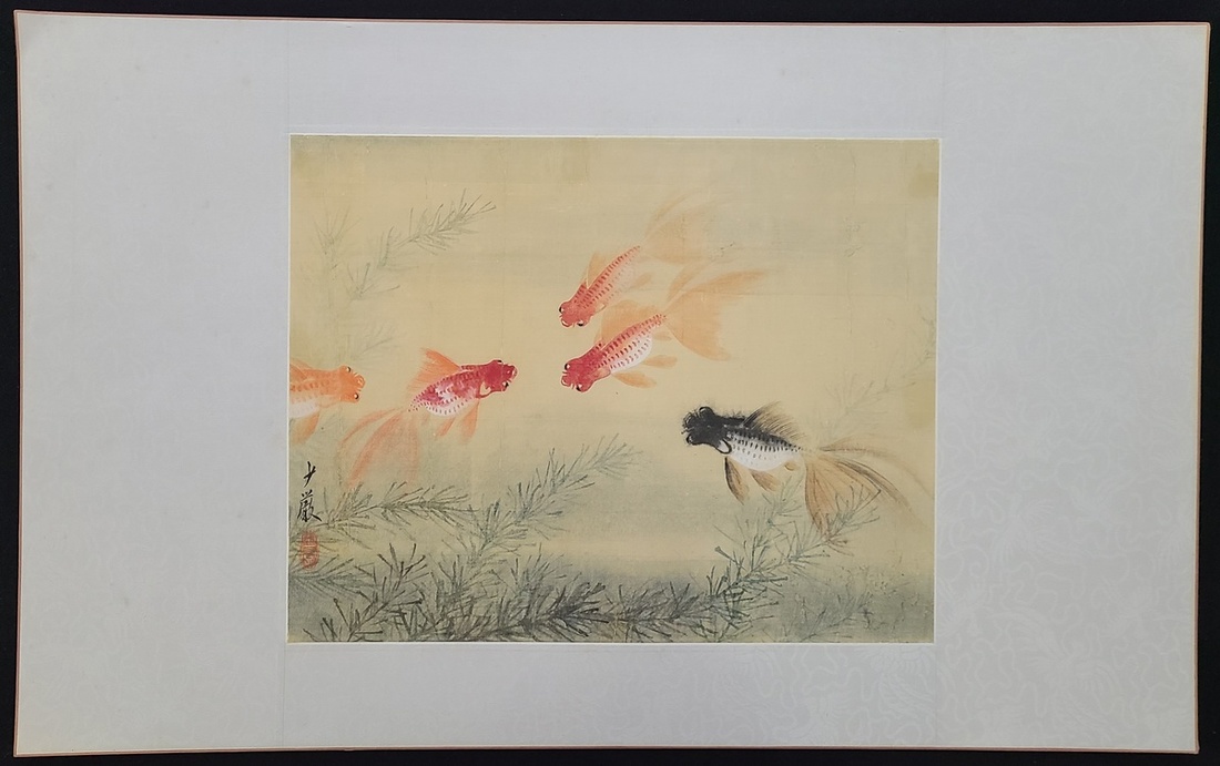 Ou Shao Yan (1942-) "goldfish" painted on fan. Painting size: 26x33.5cm