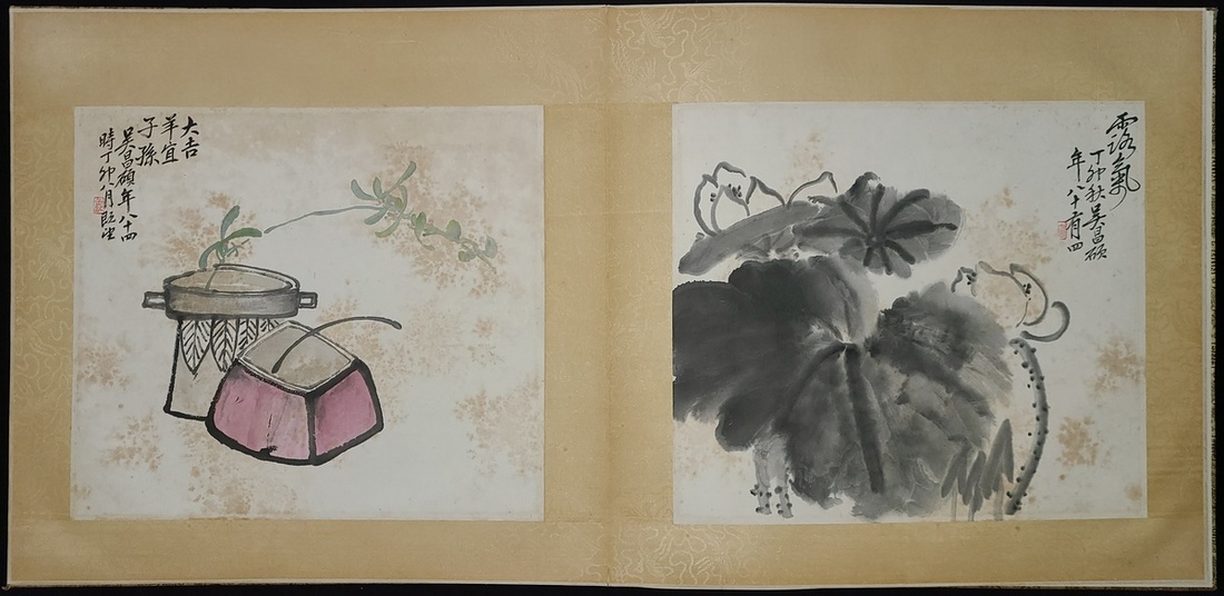 Wu Chang Shuo painting album. Nine flower and fruit paintings, mounted in an accordion binding album. Size: 42.4x44.5cm, painting size: 30x35cm. So as is.